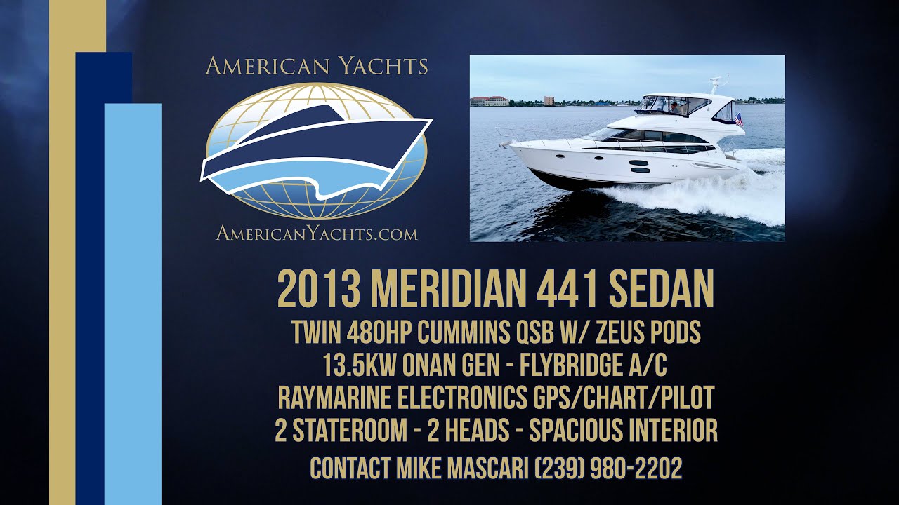 Why Knot is a beautifully maintained 2013 Meridian 441 Sedan Bridge offering an ideal layout for extended cruising or entertaining. Powered by twin Cummins QSB Zeus Pod Drives with joystick docking, she delivers quiet, efficient performance and effortless handling.