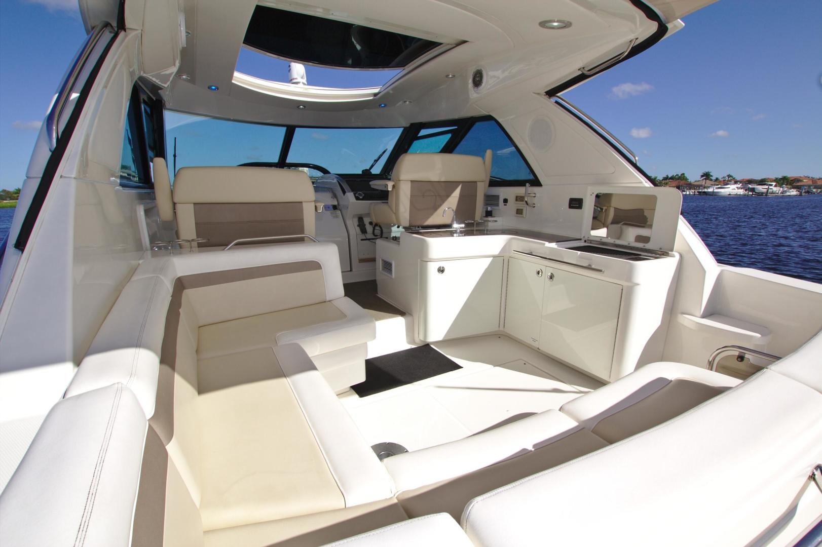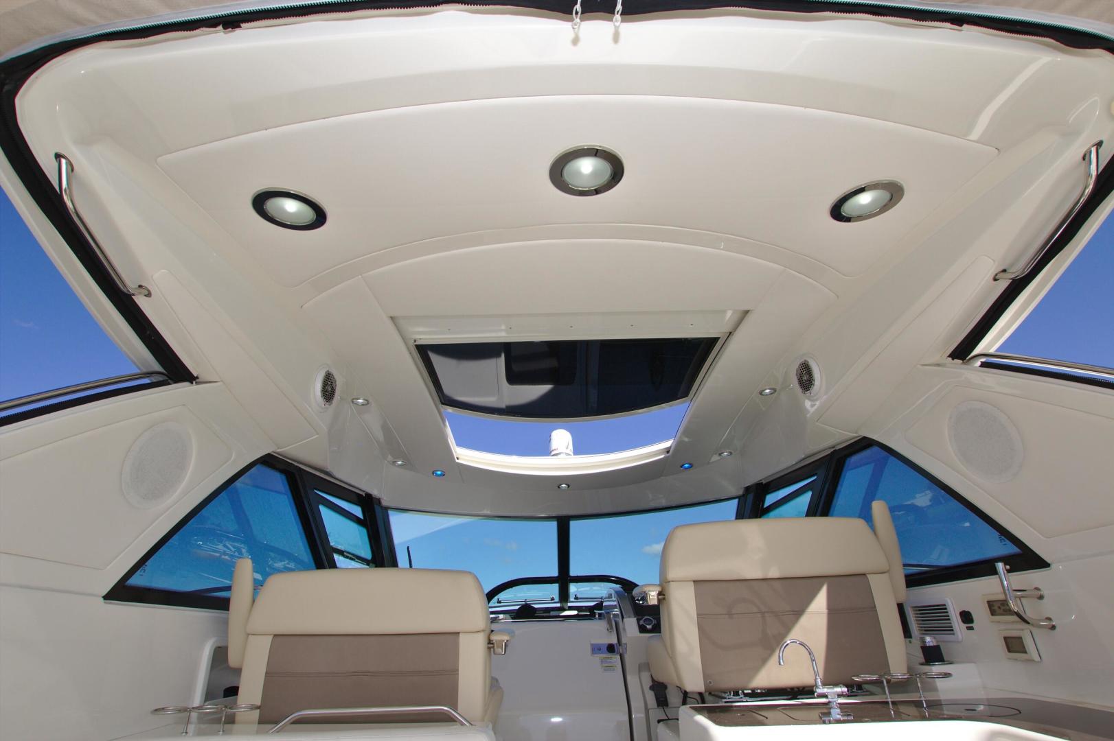 The open cabin of the 450 Sundancer stretches all the way from the spacious galley and combination salon/dining area back to the dedicated media room. It invokes the great room concept of many modern homes but is rendered in the ultimate mobility of Sundancer design. This open-concept design makes the yacht airier and more spacious with a modern sensibility that will suit trendsetters.