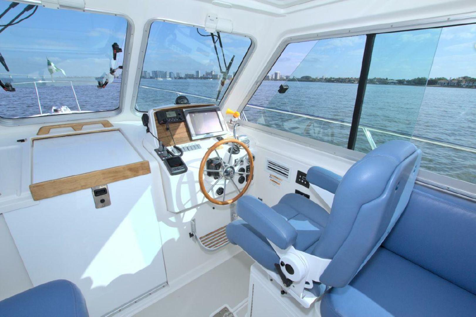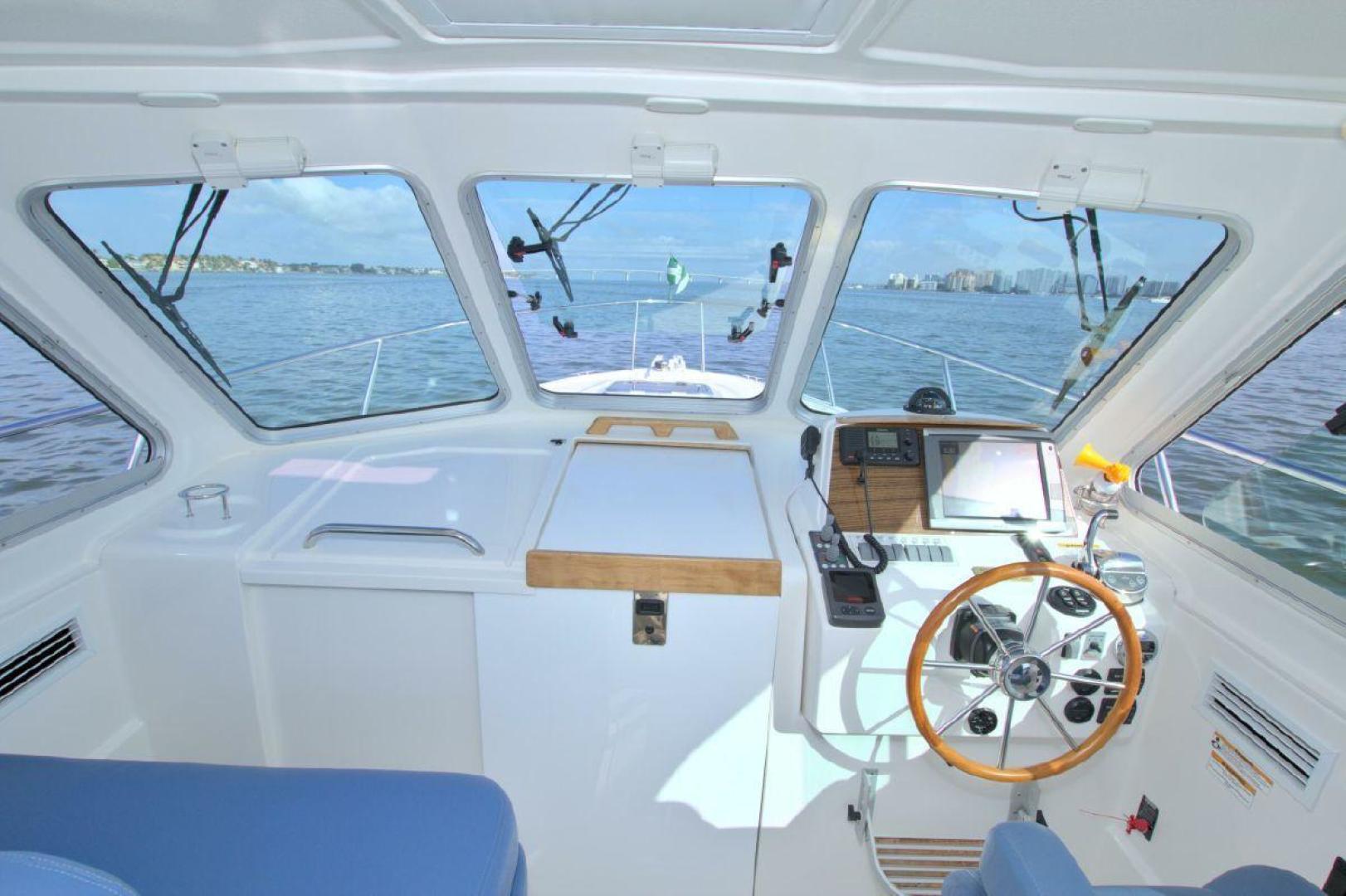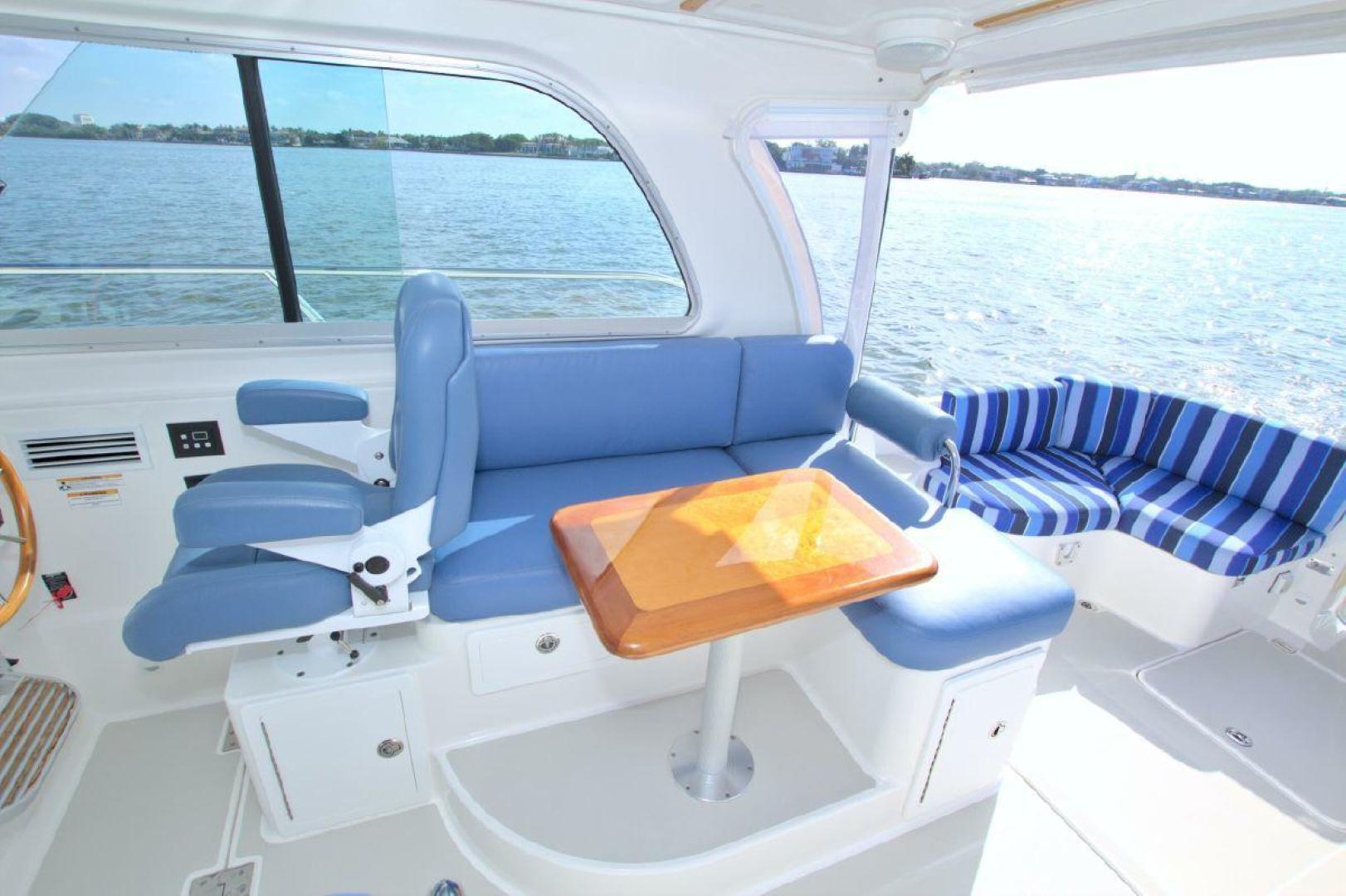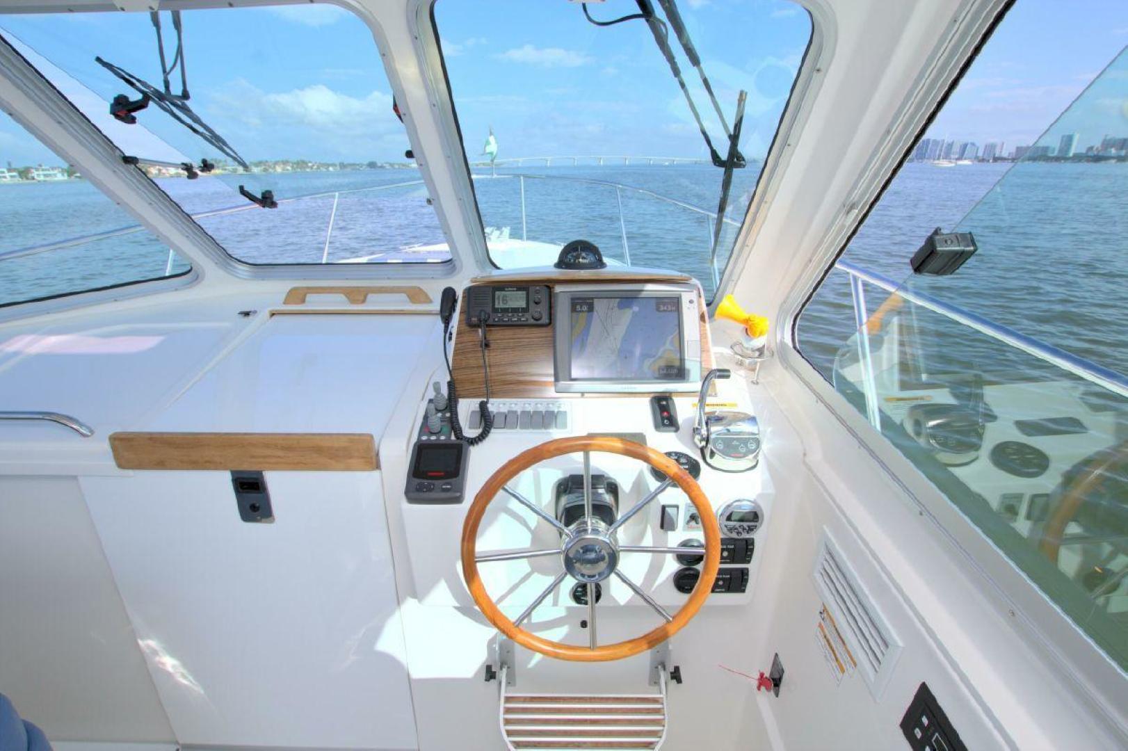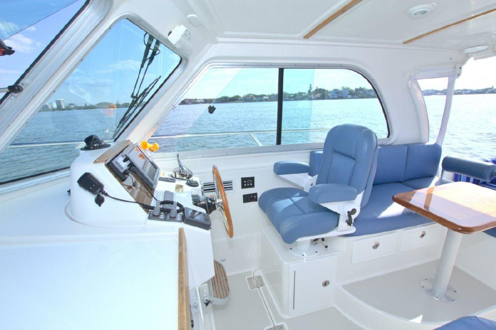 Step inside and be greeted by an air-conditioned interior that features beautiful varnished cherry cabinetry and a teak and holly sole, adding just the right touch of nautical elegance. The helm and seating areas have excellent visibility thanks to the large windows and is also air-conditioned. Port settee easily converts into an additional berth. The boat comes equipped with Bow and Stern thrusters and electronics such as a Garmin 7212 GPS map and Garmin Radar.