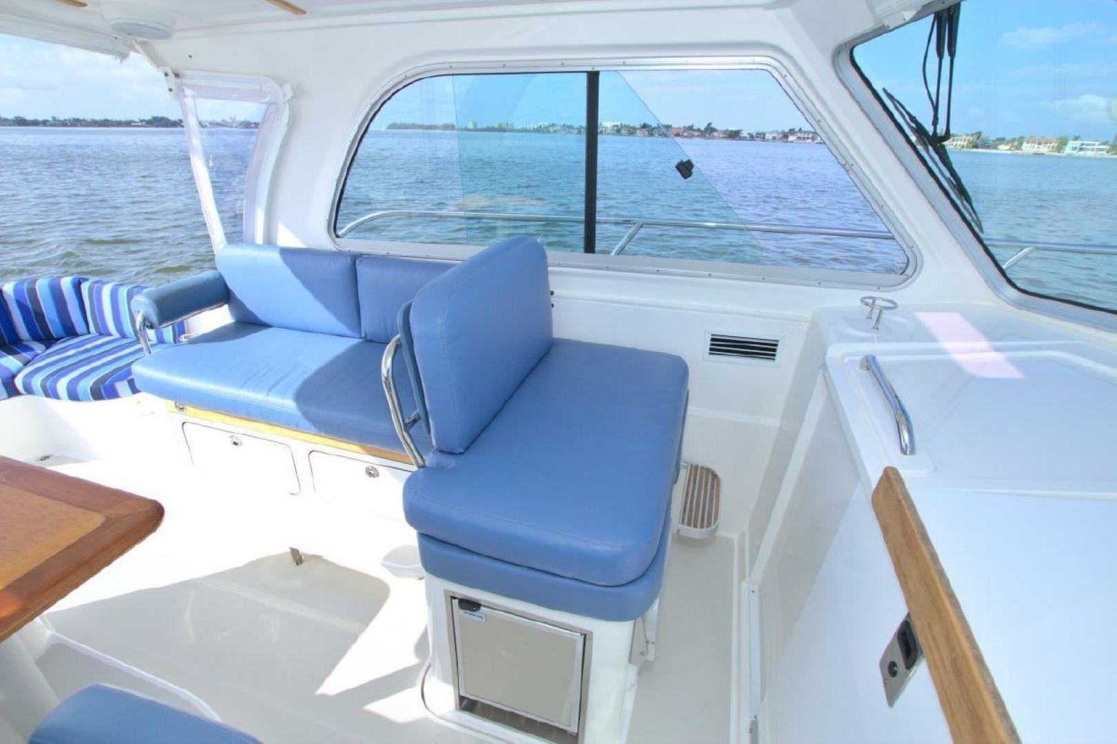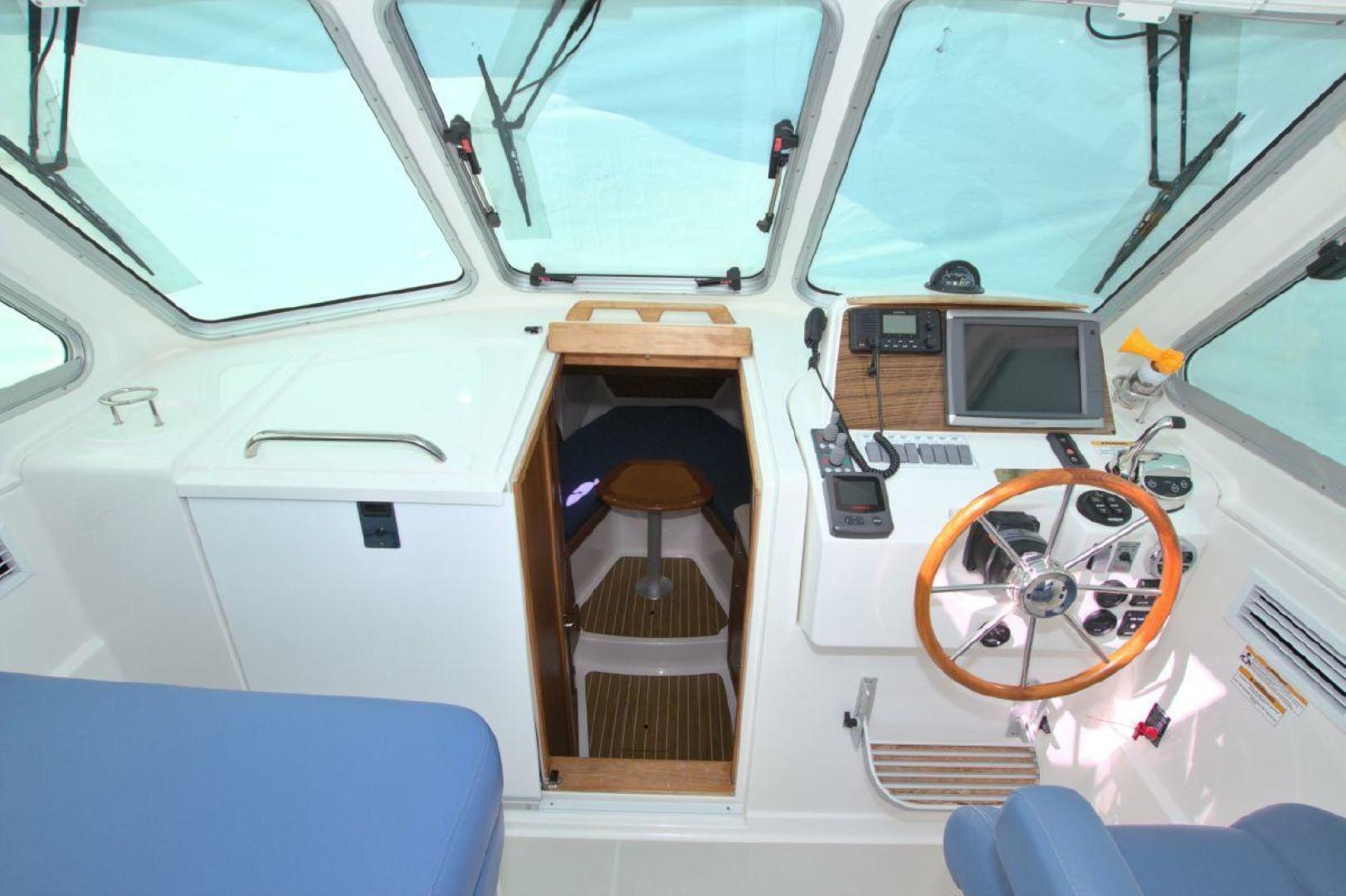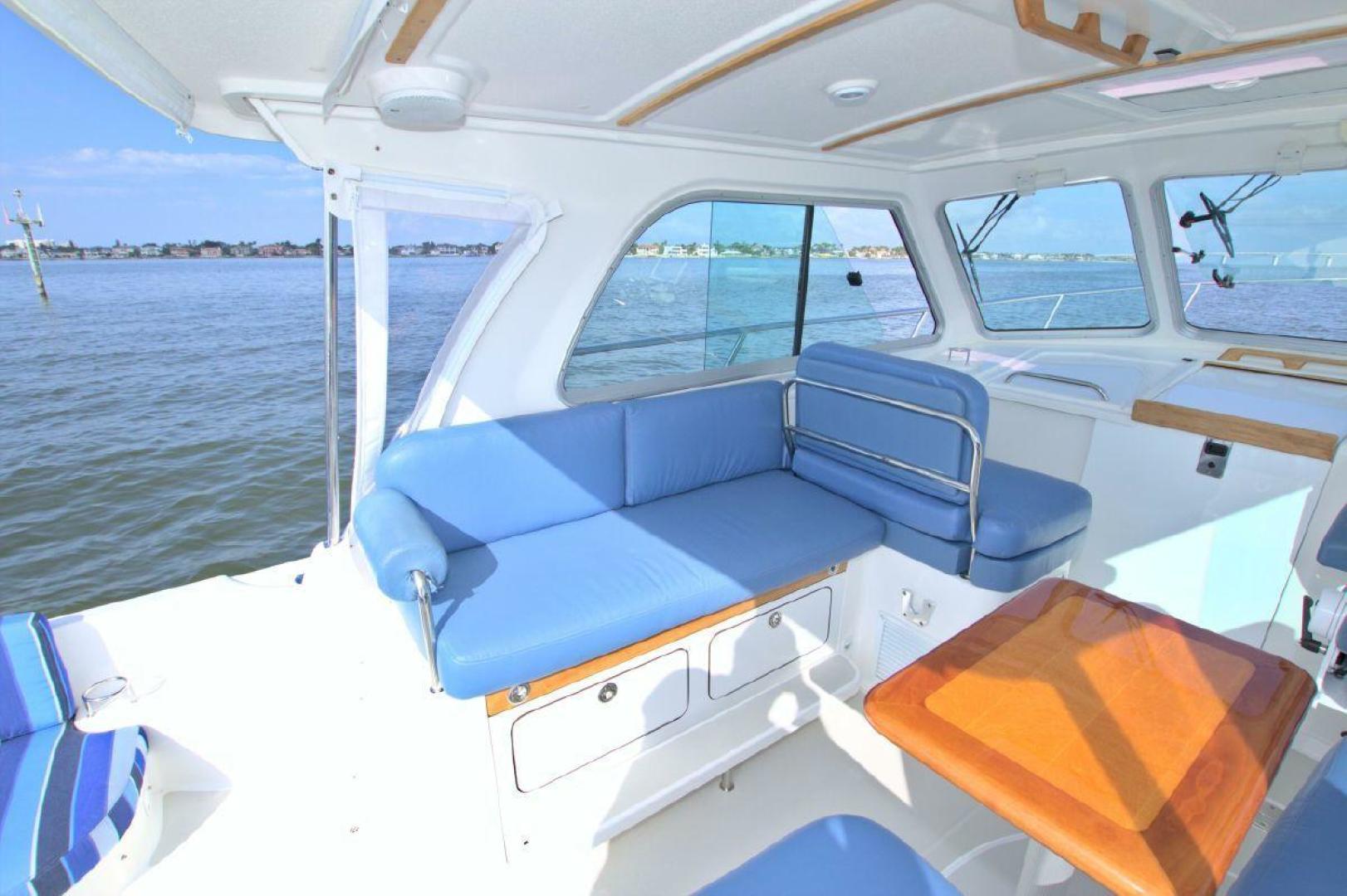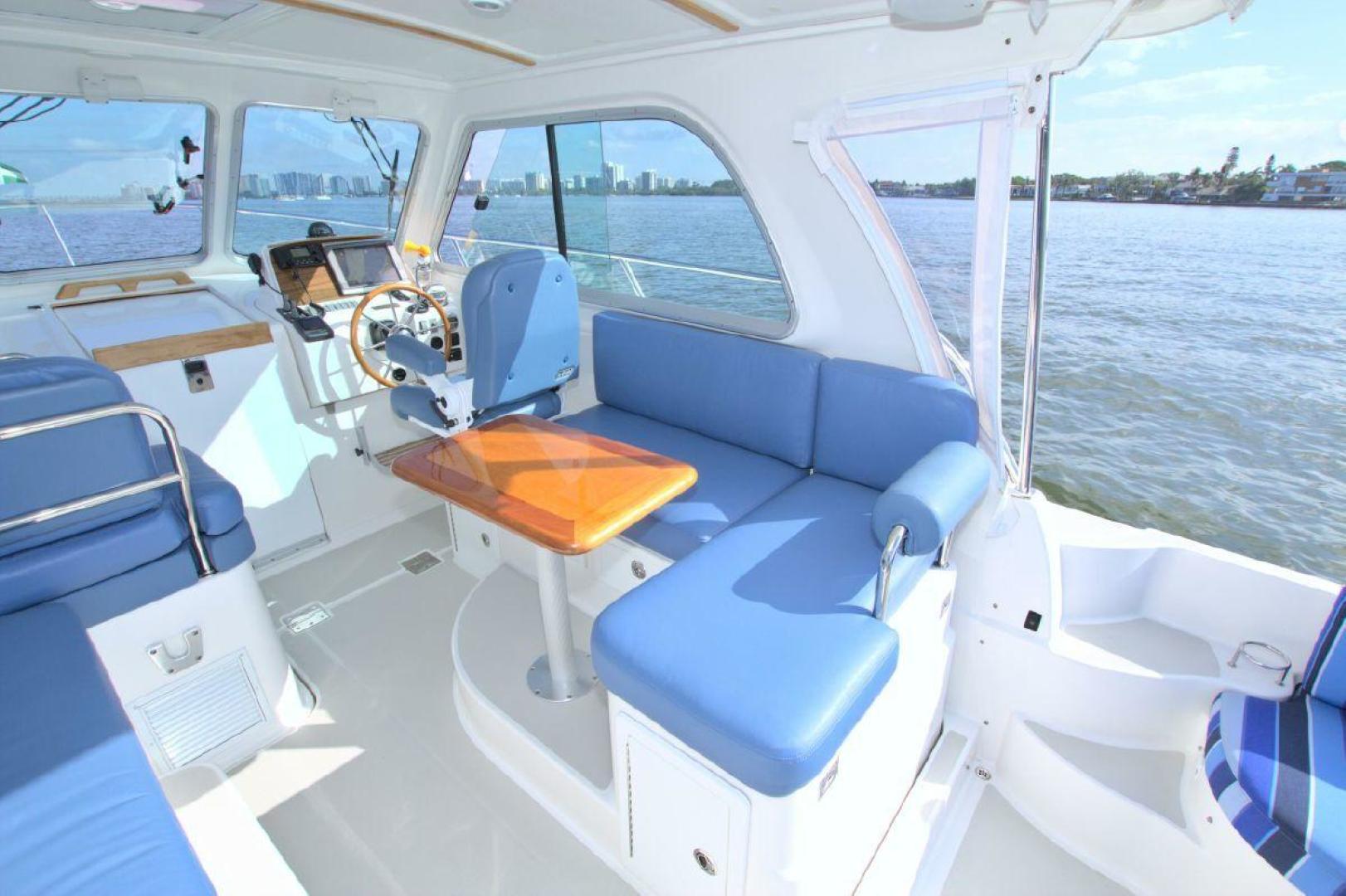 Step inside and be greeted by an air-conditioned interior that features beautiful varnished cherry cabinetry and a teak and holly sole, adding just the right touch of nautical elegance. The helm and seating areas have excellent visibility thanks to the large windows and is also air-conditioned. Port settee easily converts into an additional berth. The boat comes equipped with Bow and Stern thrusters and electronics such as a Garmin 7212 GPS map and Garmin Radar.