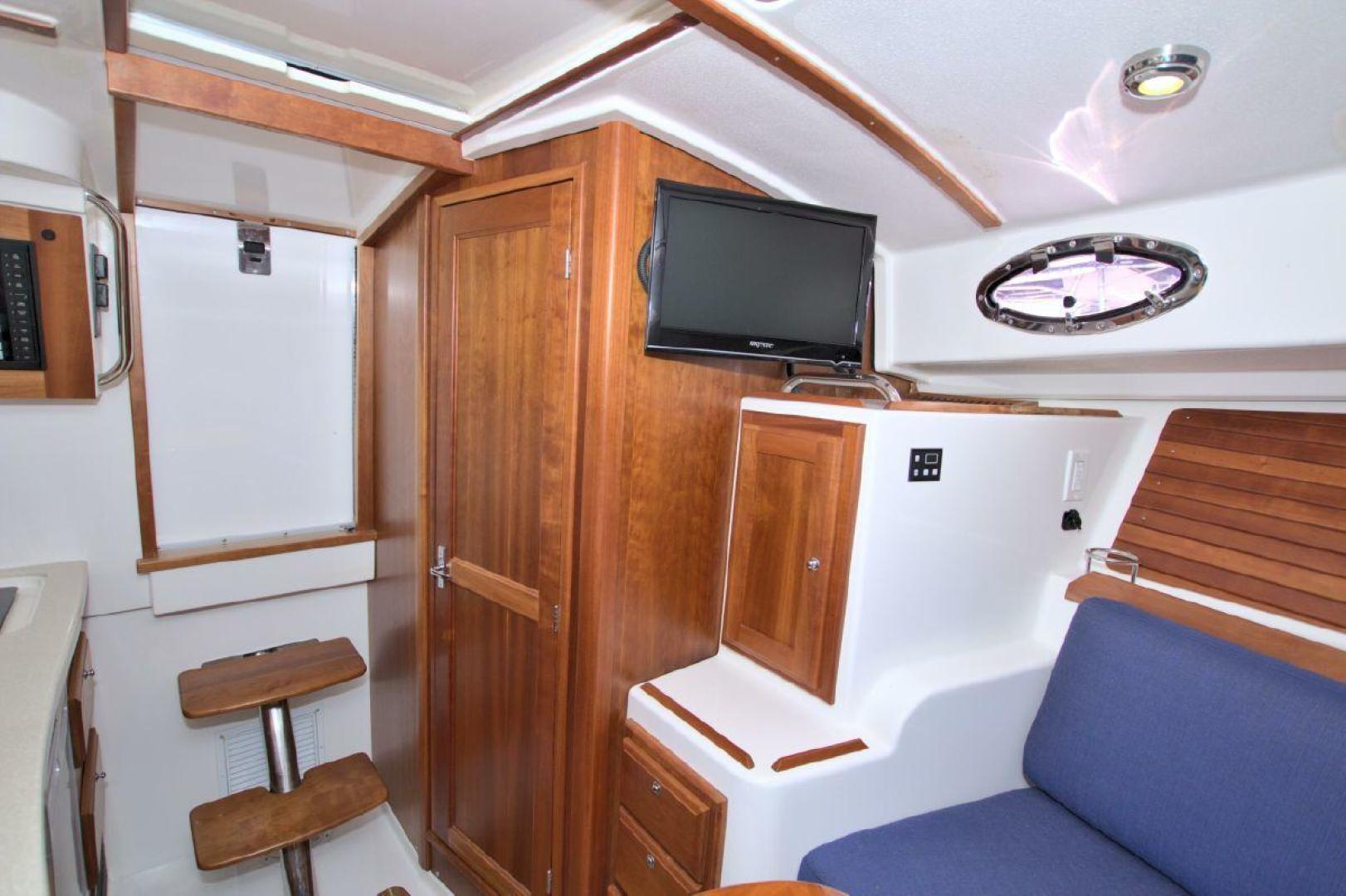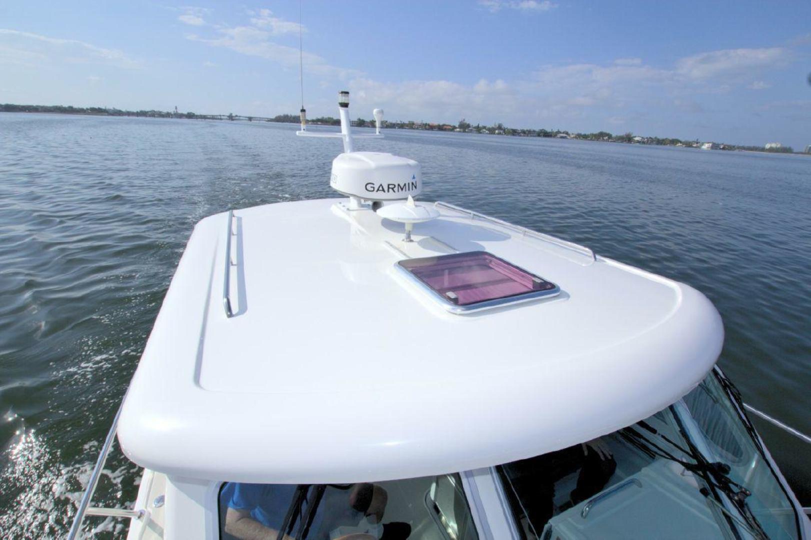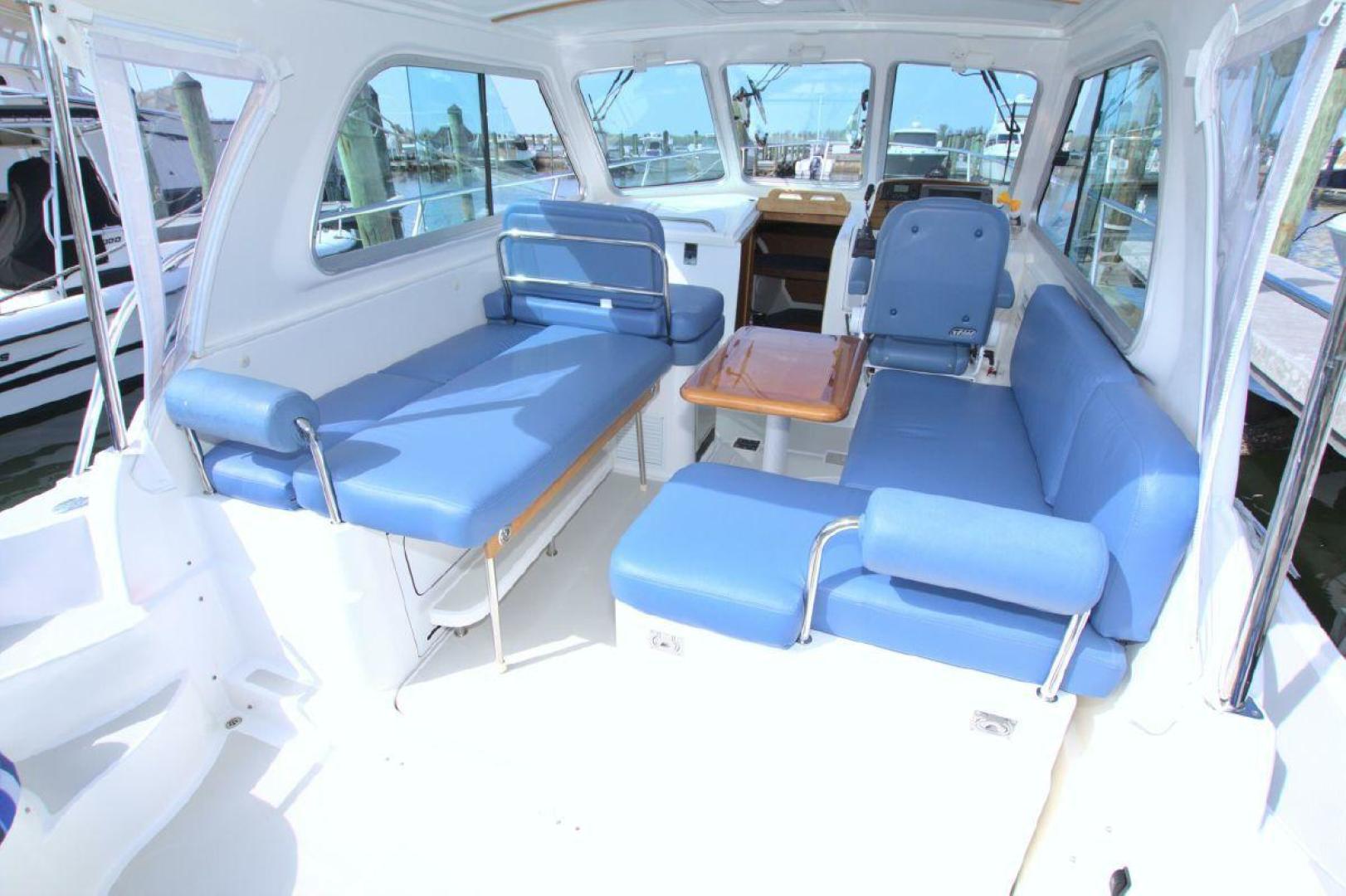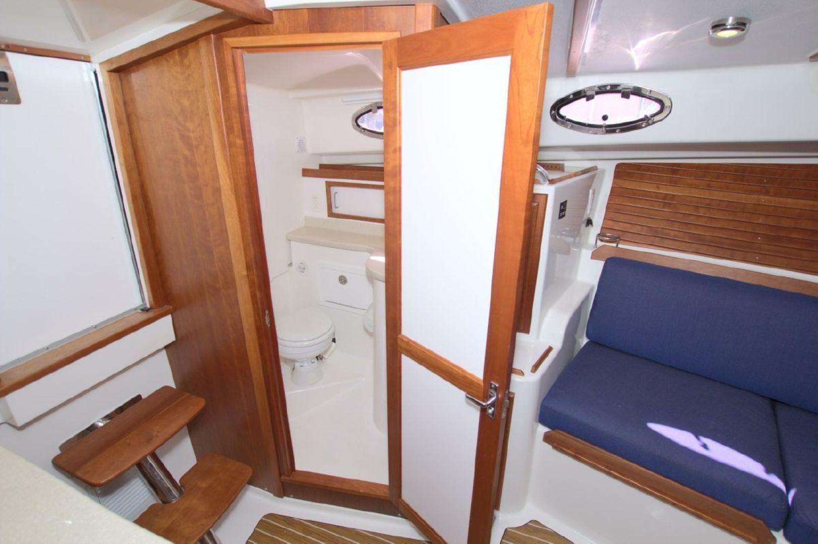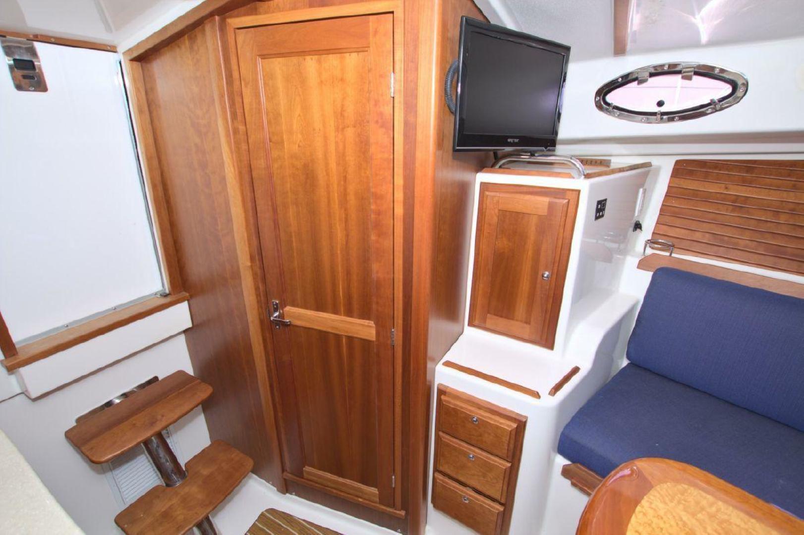 Step inside and be greeted by an air-conditioned interior that features beautiful varnished cherry cabinetry and a teak and holly sole, adding just the right touch of nautical elegance. The helm and seating areas have excellent visibility thanks to the large windows and is also air-conditioned. Port settee easily converts into an additional berth. The boat comes equipped with Bow and Stern thrusters and electronics such as a Garmin 7212 GPS map and Garmin Radar.