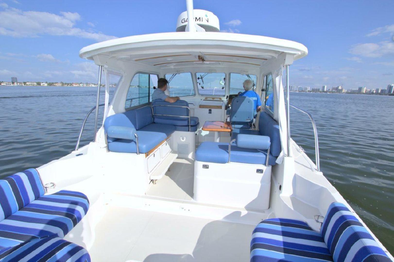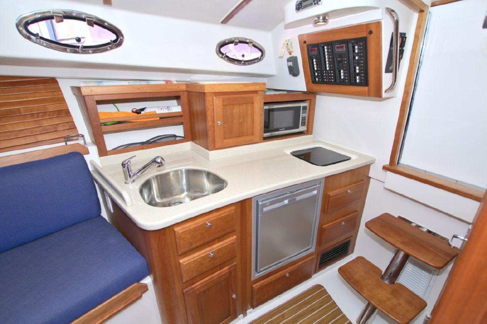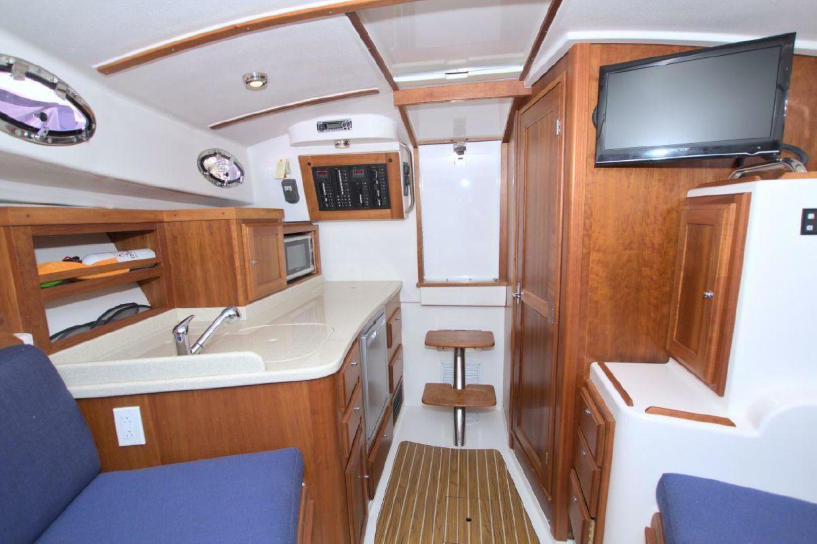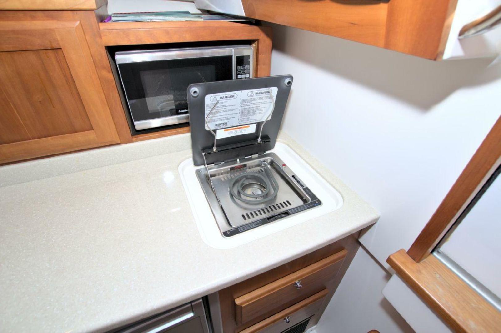 Step inside and be greeted by an air-conditioned interior that features beautiful varnished cherry cabinetry and a teak and holly sole, adding just the right touch of nautical elegance. The helm and seating areas have excellent visibility thanks to the large windows and is also air-conditioned. Port settee easily converts into an additional berth. The boat comes equipped with Bow and Stern thrusters and electronics such as a Garmin 7212 GPS map and Garmin Radar.