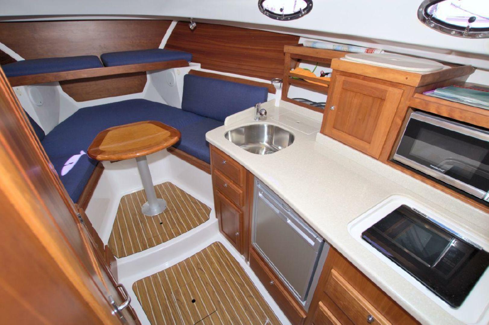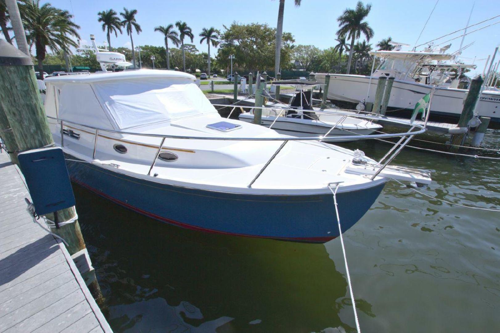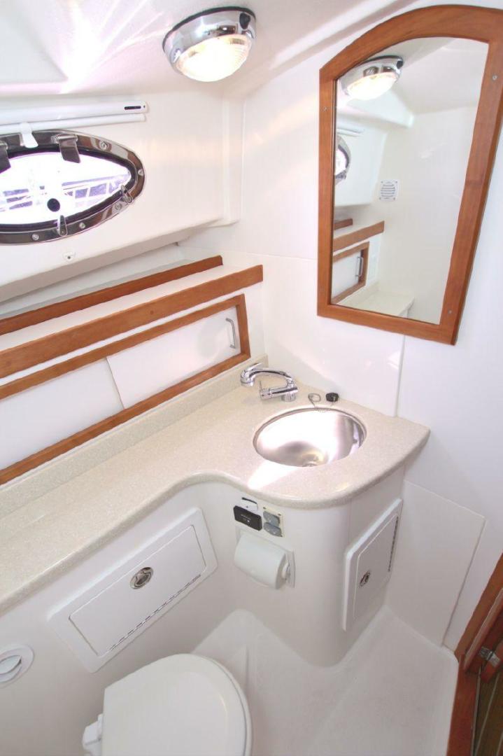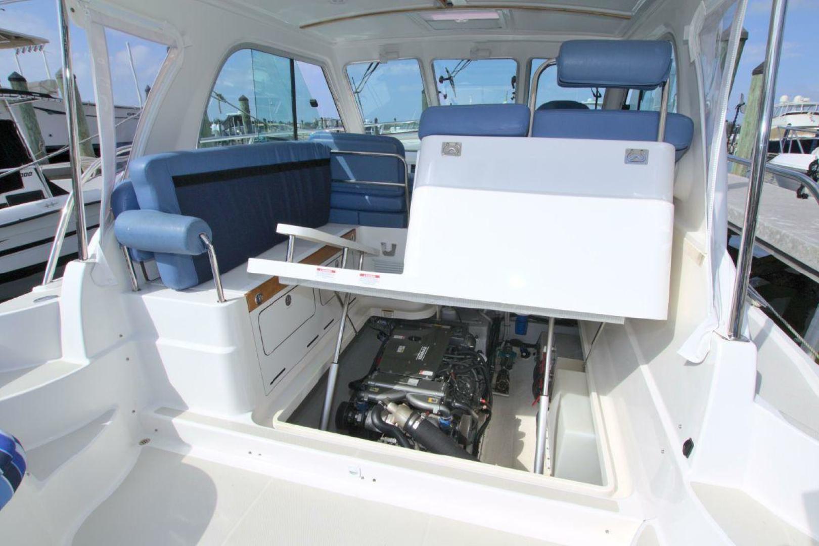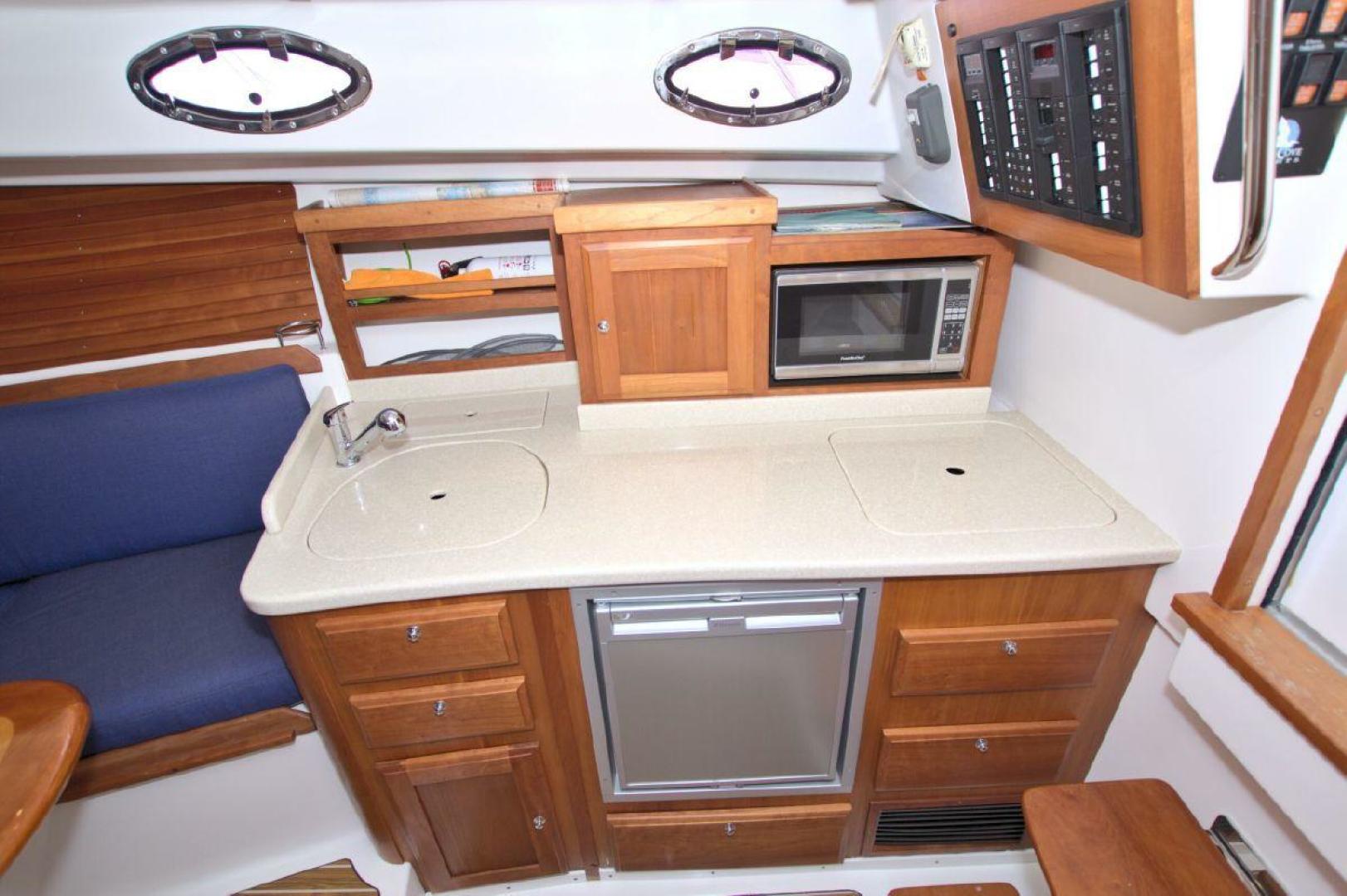 Step inside and be greeted by an air-conditioned interior that features beautiful varnished cherry cabinetry and a teak and holly sole, adding just the right touch of nautical elegance. The helm and seating areas have excellent visibility thanks to the large windows and is also air-conditioned. Port settee easily converts into an additional berth. The boat comes equipped with Bow and Stern thrusters and electronics such as a Garmin 7212 GPS map and Garmin Radar.