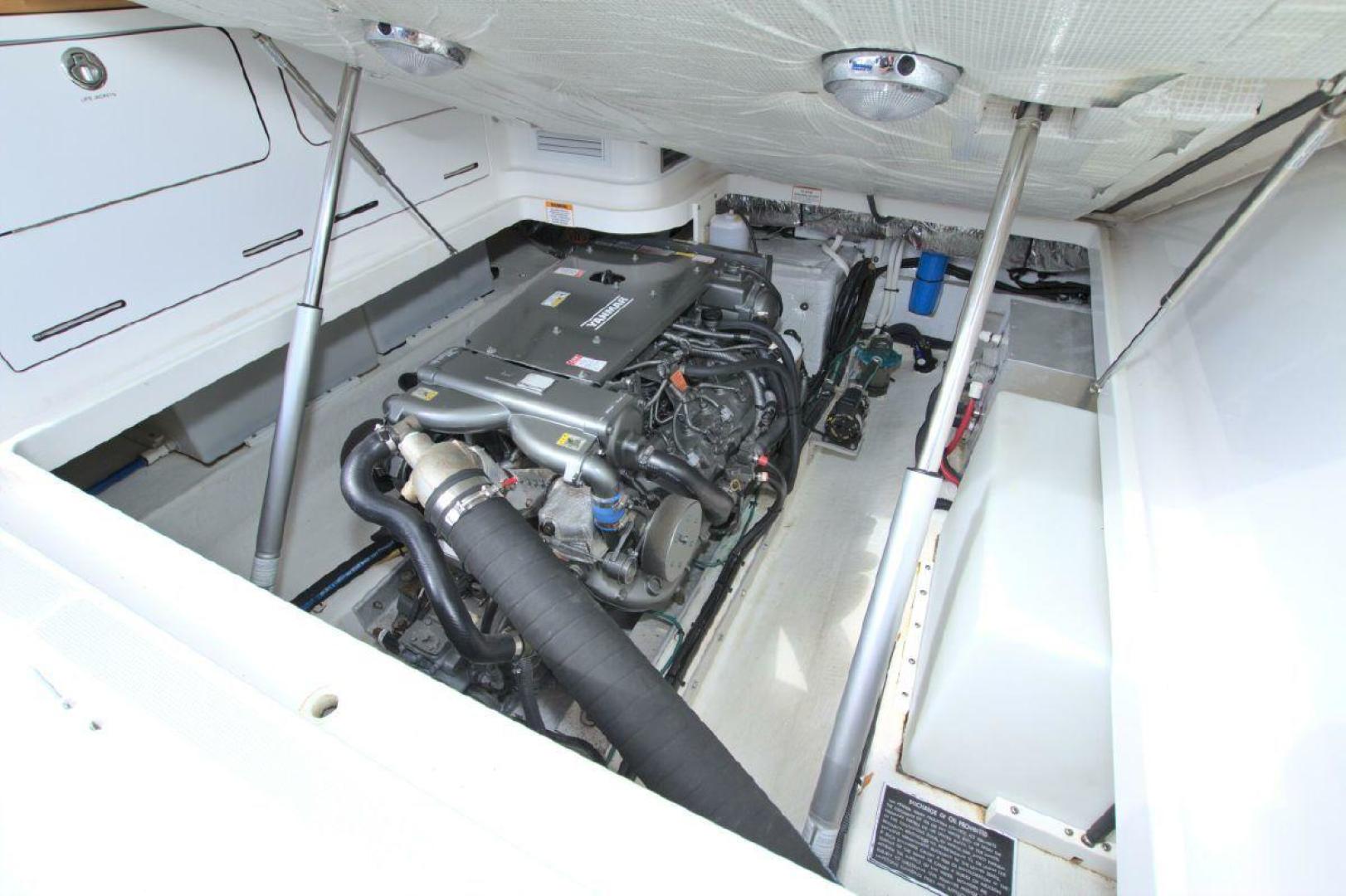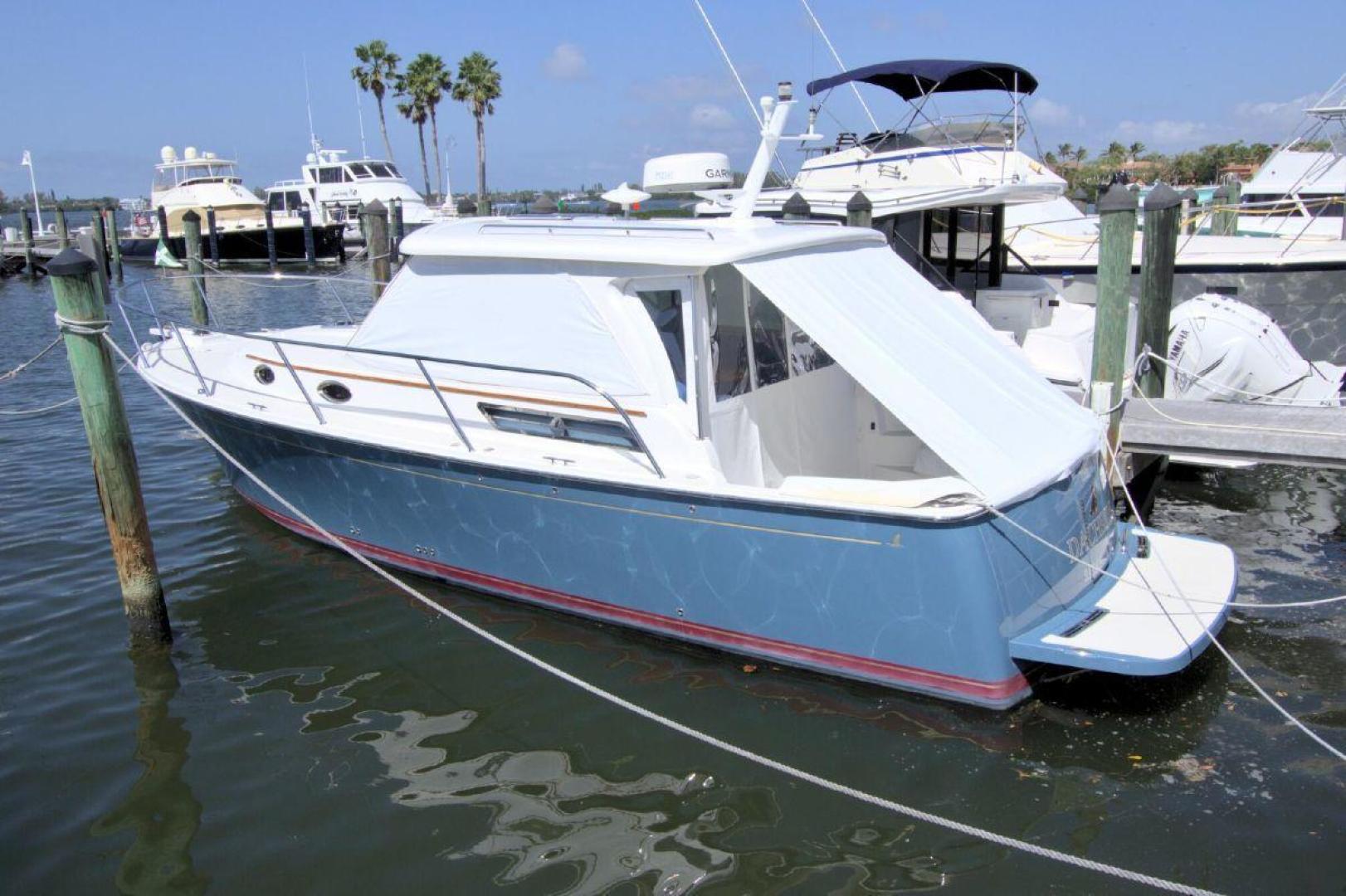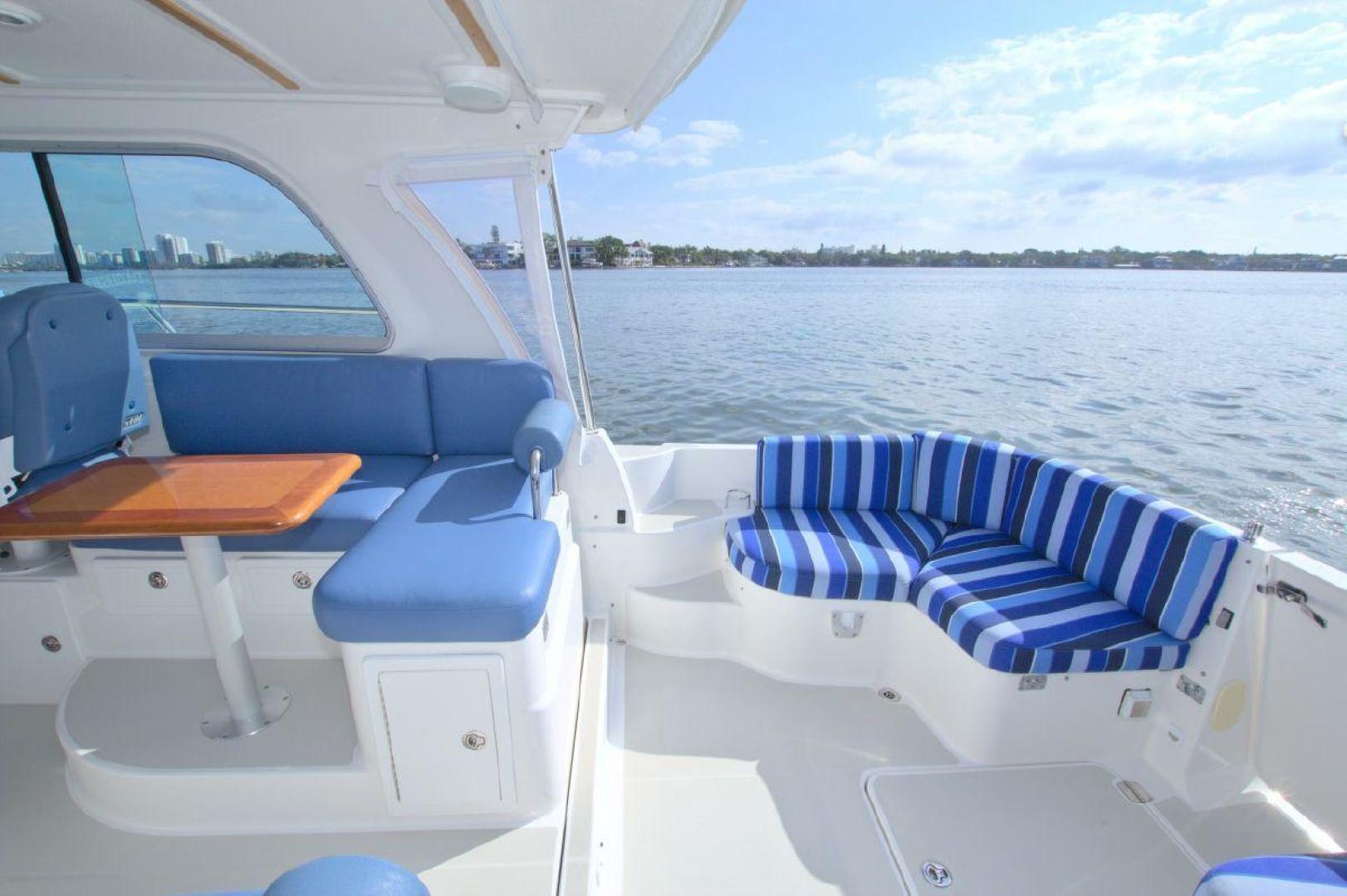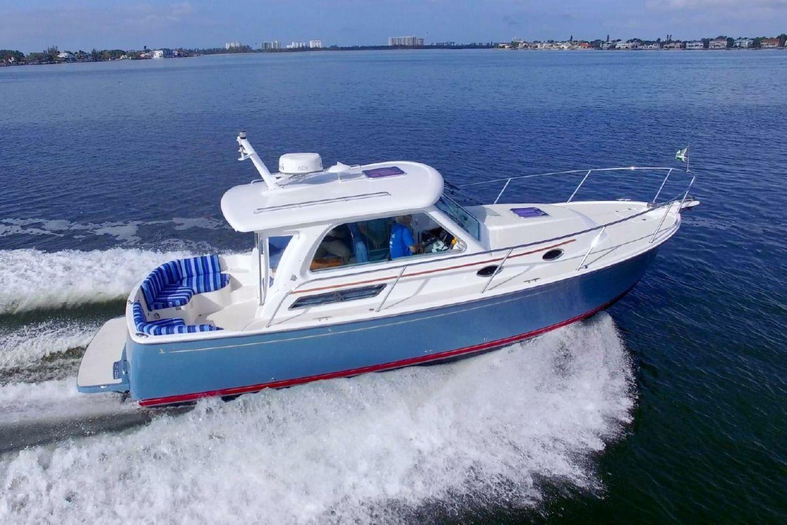 This ONE OWNER boat features attractive "Stars and Stripes" Awlgrip, Blue hull sides that make it stand out from the rest. It also comes optioned with the larger Yanmar 8LV 370hp engine with just 235 hours, ensuring that you'll have all the power you need to cruise and explore.