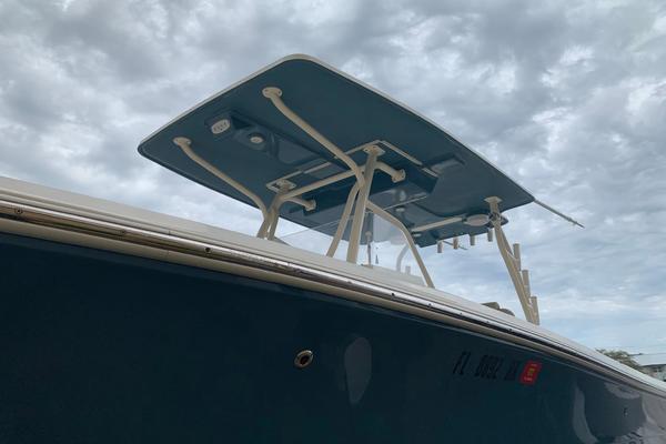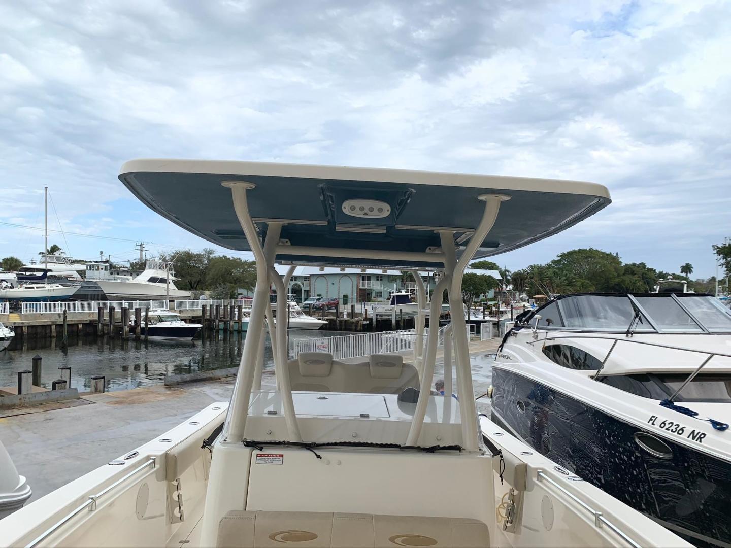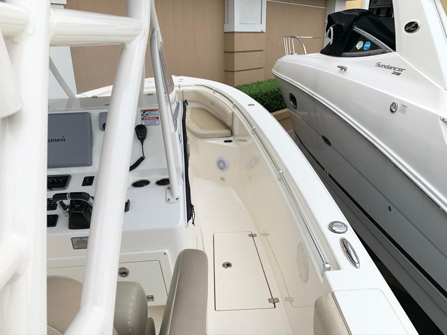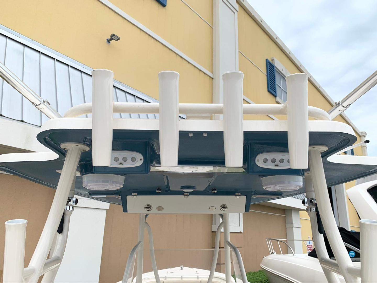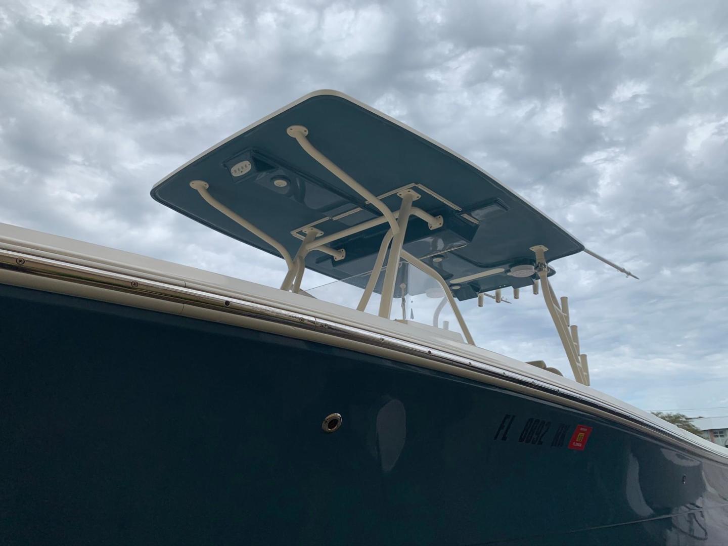 All deck hardware and the bow rail are recessed and the deck is level from stem to stern for 360 degree fish fighting maneuverability. Integrated into the console and leaning post, the metalwork of the optional hard top carries the clean lines and stylish looks of the deck upward to a two-tone top with molded-in pods for speakers, three-hued LED lighting and spreader lights. Comfort features include soft and elegantly appointed upholstery on seating for 11 and a full step-down console with forward access.