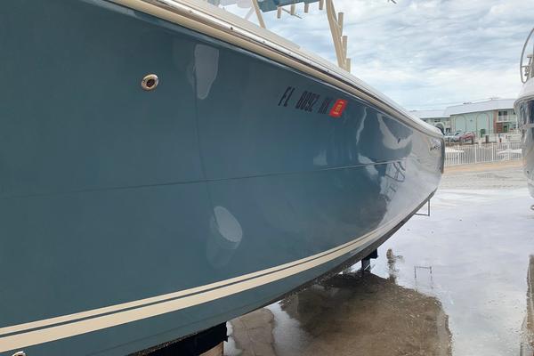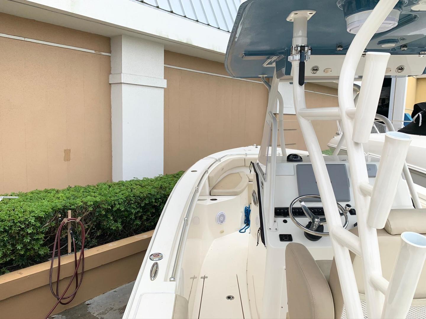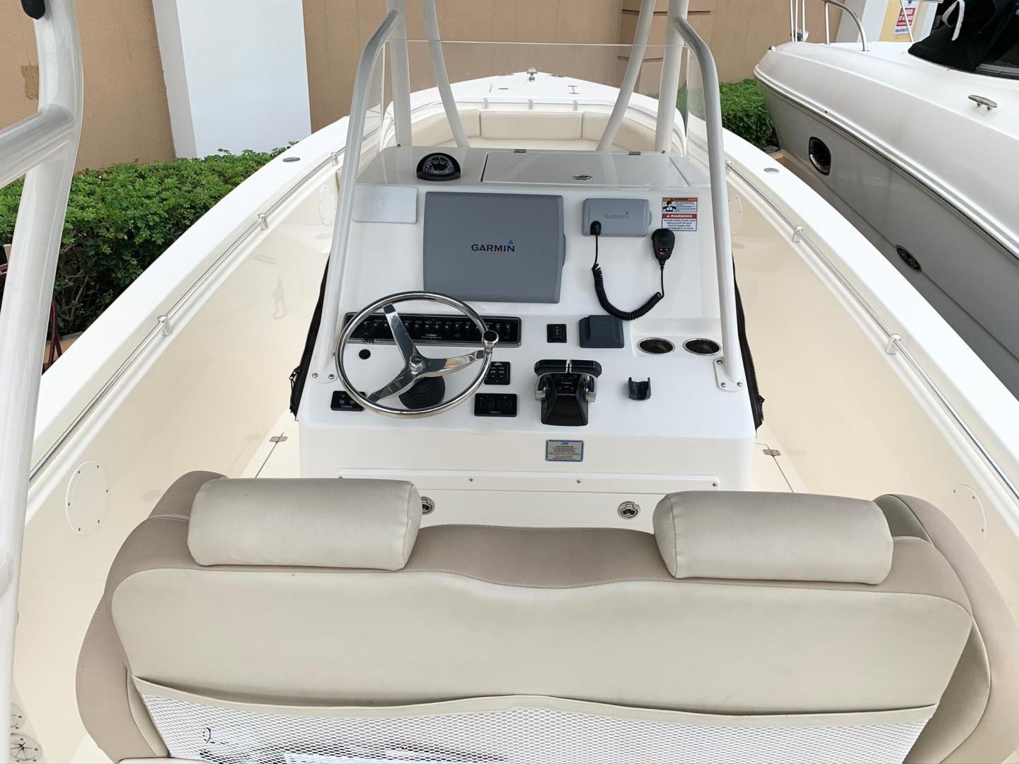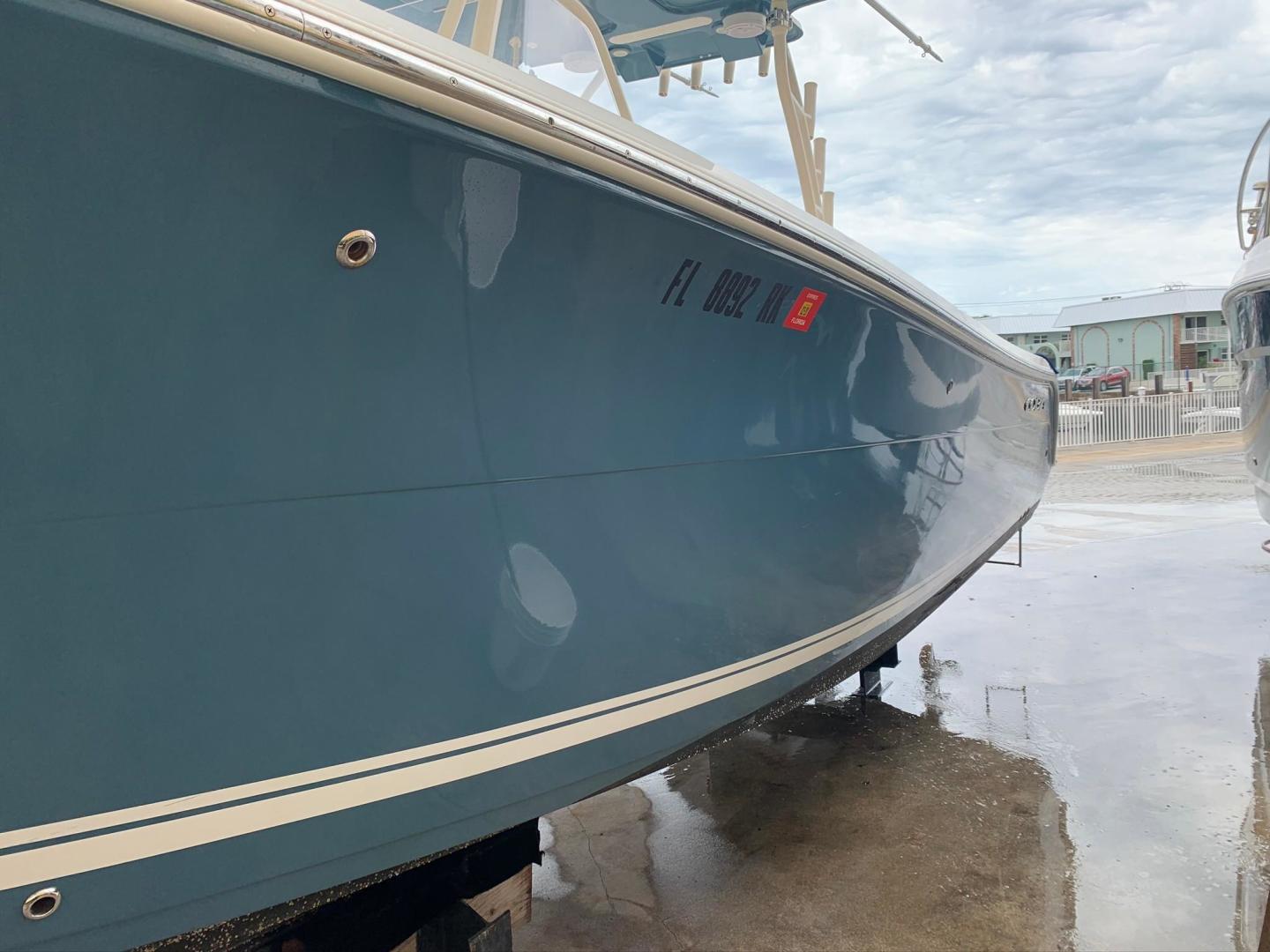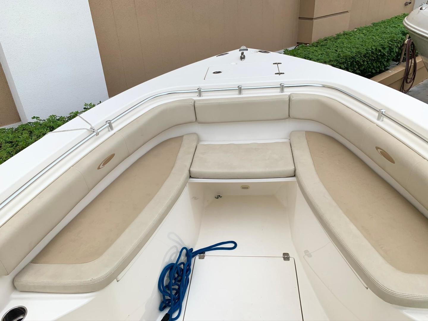 All deck hardware and the bow rail are recessed and the deck is level from stem to stern for 360 degree fish fighting maneuverability. Integrated into the console and leaning post, the metalwork of the optional hard top carries the clean lines and stylish looks of the deck upward to a two-tone top with molded-in pods for speakers, three-hued LED lighting and spreader lights. Comfort features include soft and elegantly appointed upholstery on seating for 11 and a full step-down console with forward access.