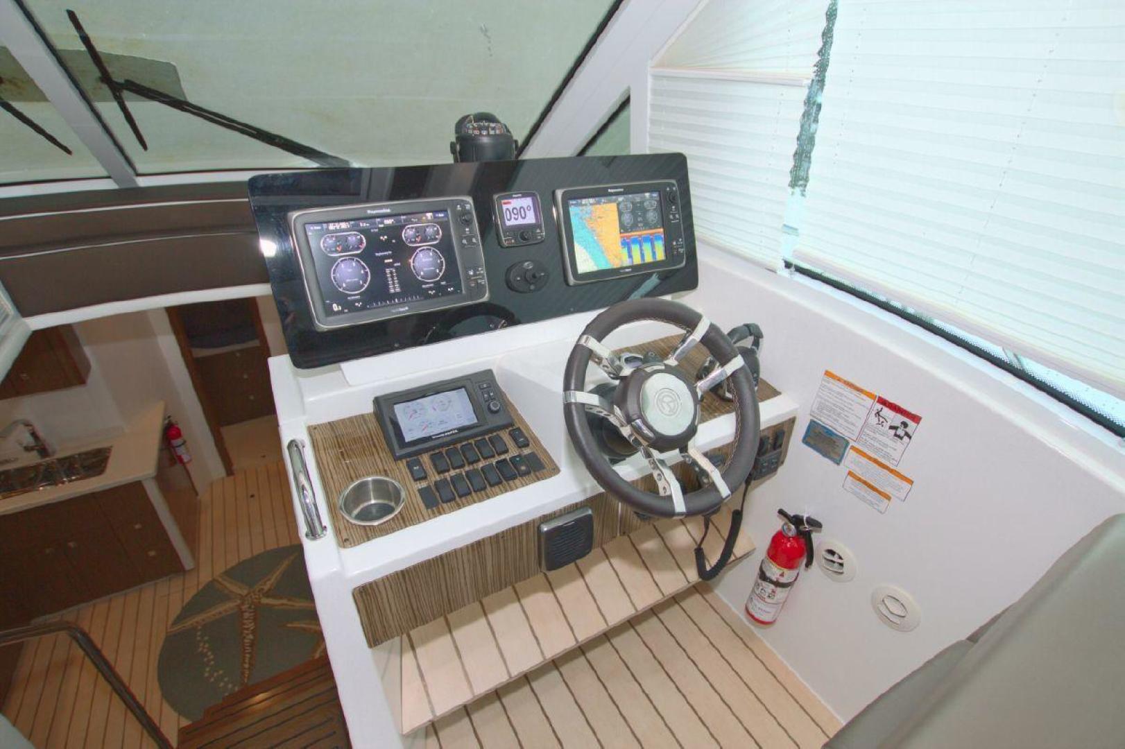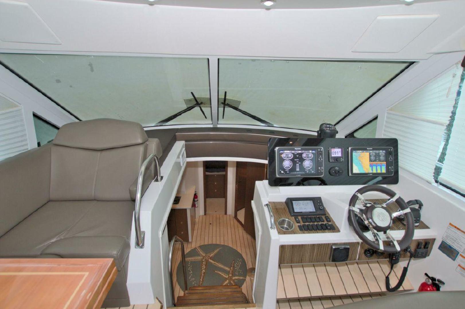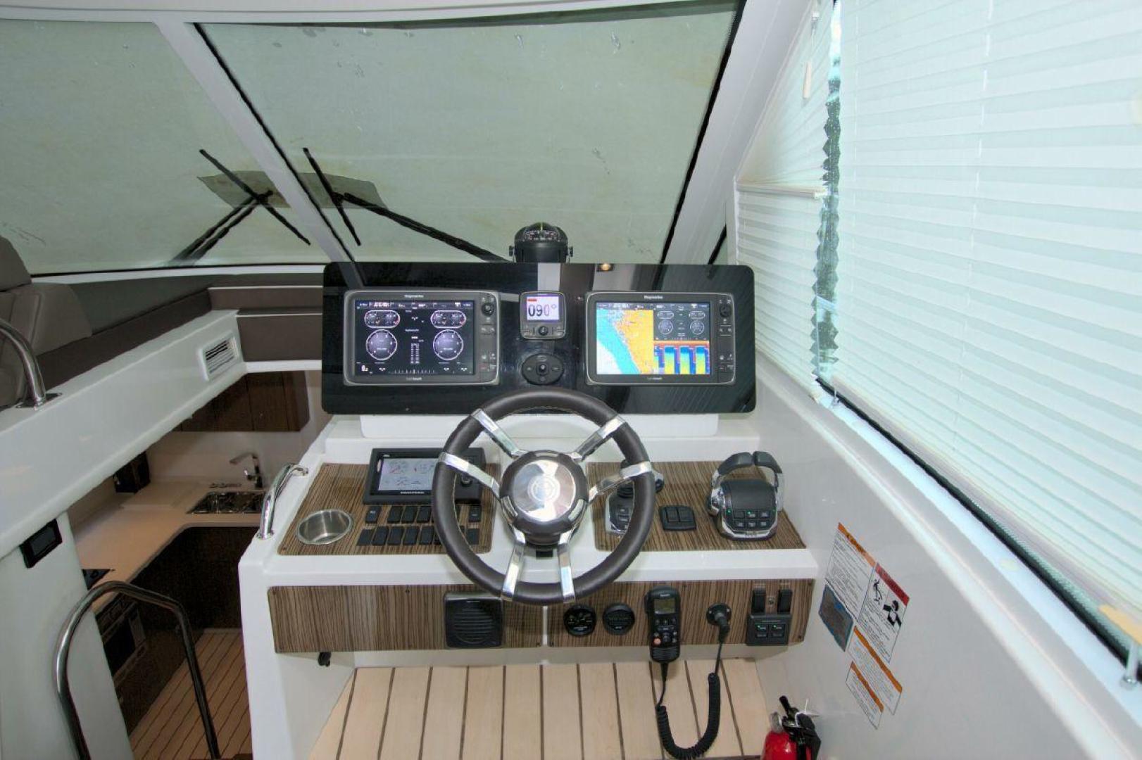 Helm has a double helm seat, with flip up bolster, and well positioned instrumentation. Electronic shift and throttle controls with the manavoverabily of IPS pod drives with joystick control.