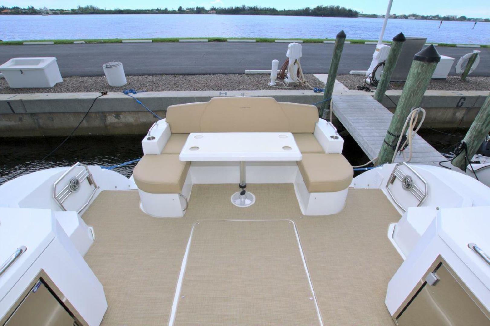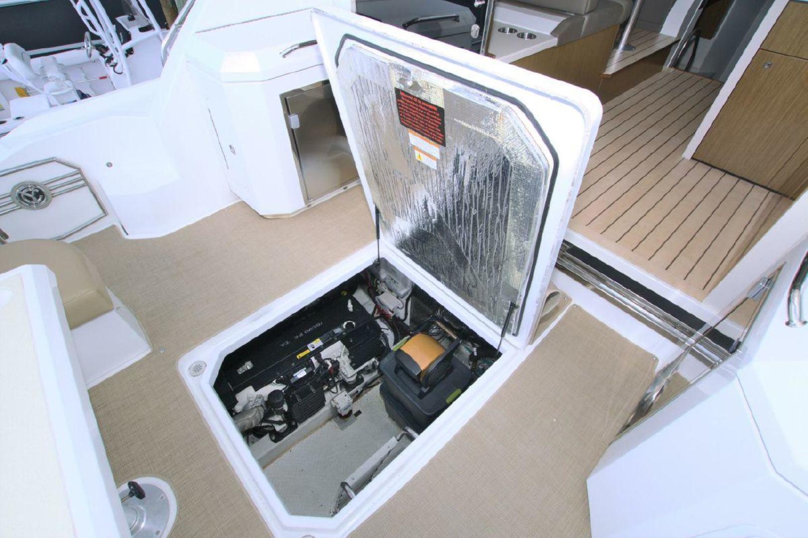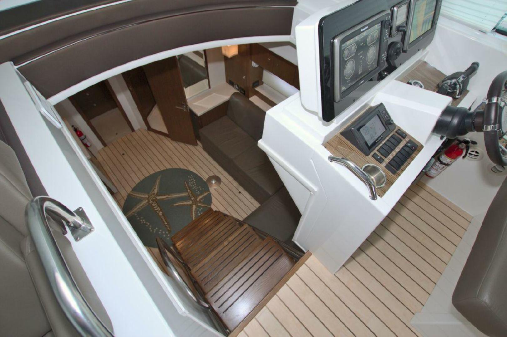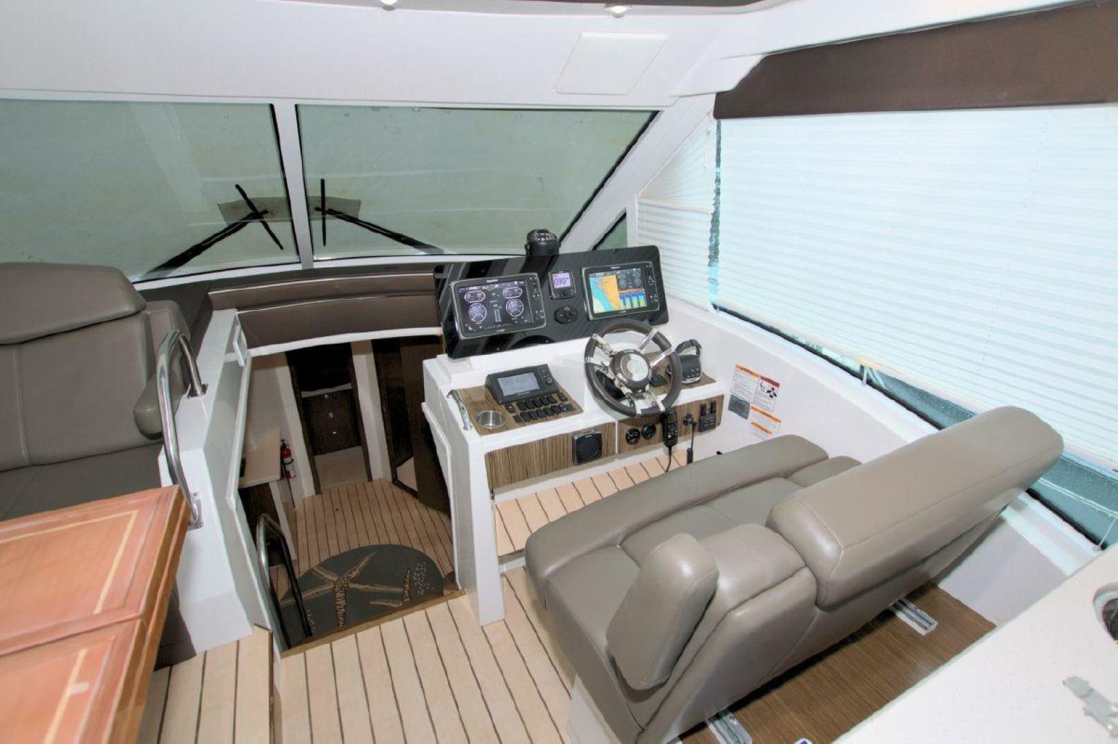 Helm has a double helm seat, with flip up bolster, and well positioned instrumentation. Electronic shift and throttle controls with the manavoverabily of IPS pod drives with joystick control.