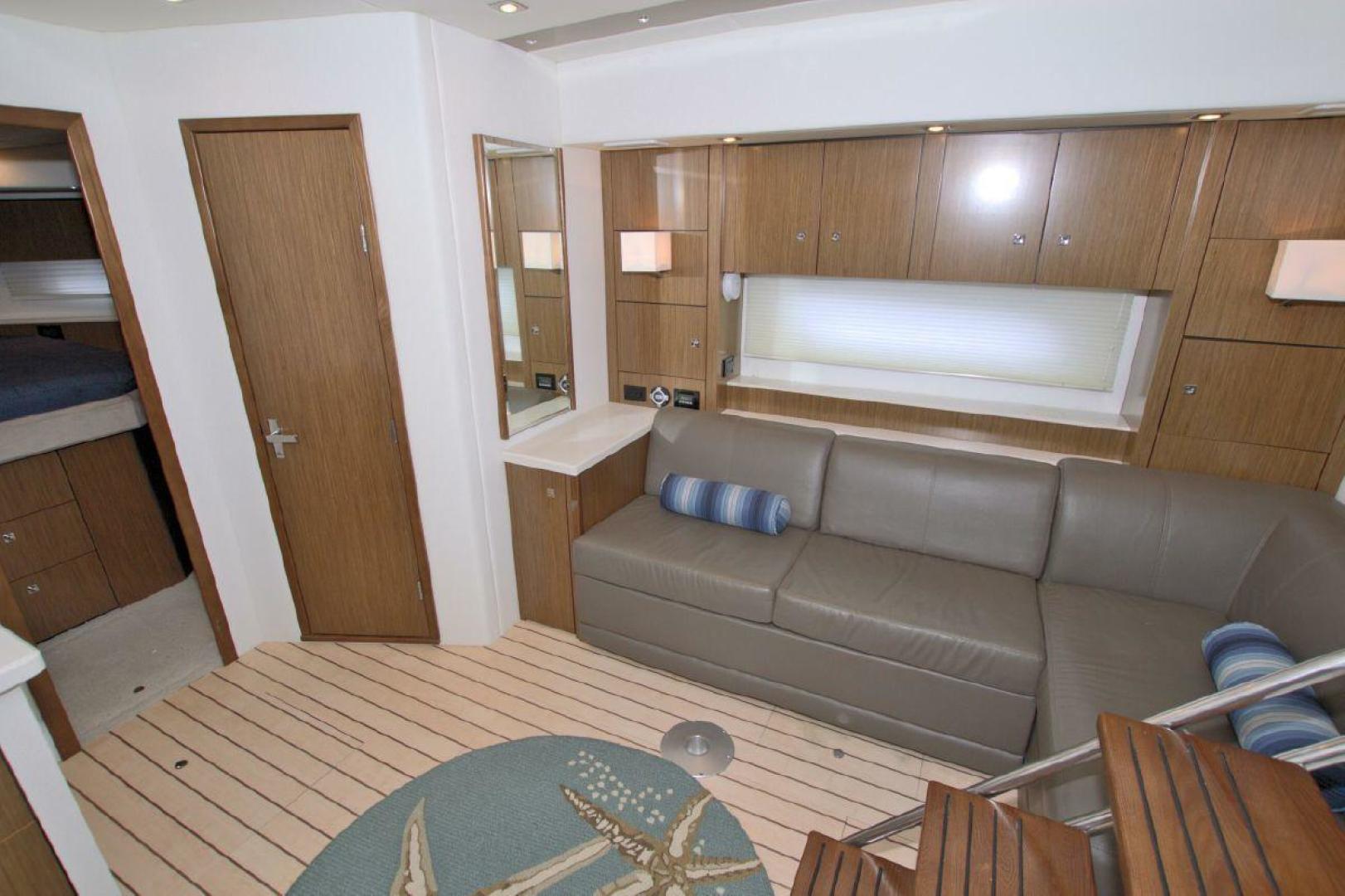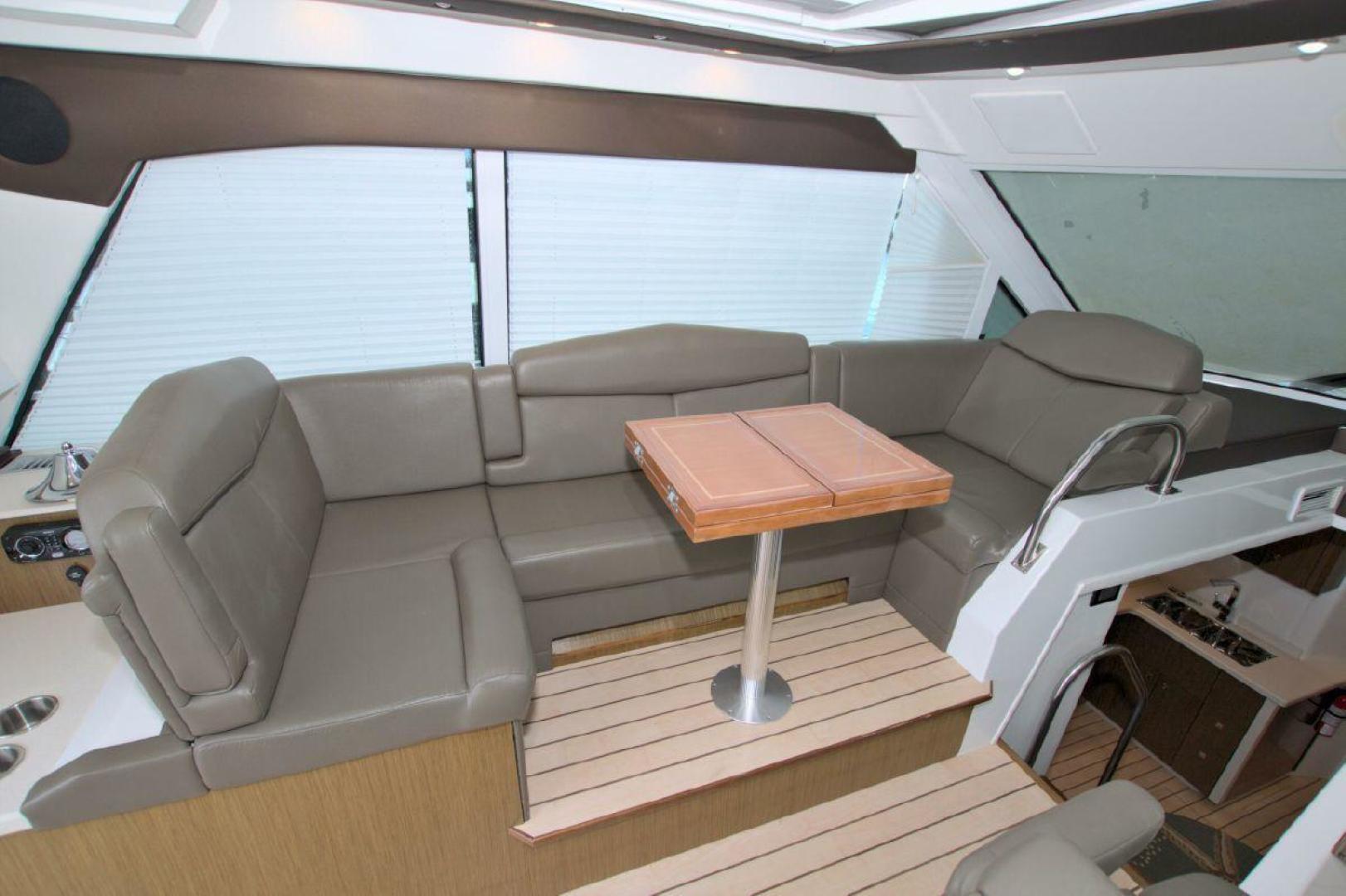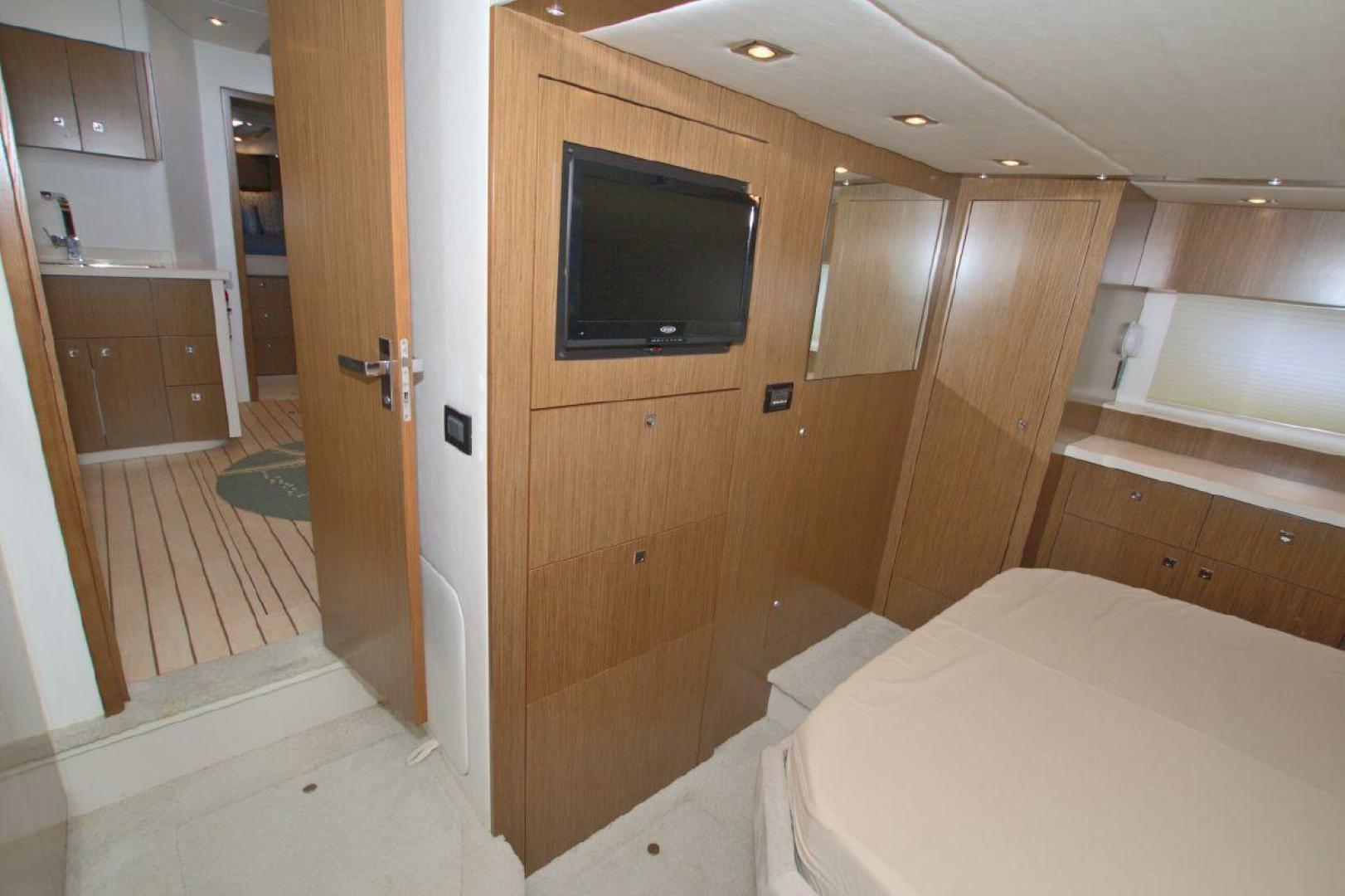 To starboard there is a large entertainment center with countertops, wet bar and hideaway TV on a remote controlled lift. To port a U shaped sette will seat 6 guests with a high low folding table. Stereo with speakers throughout.