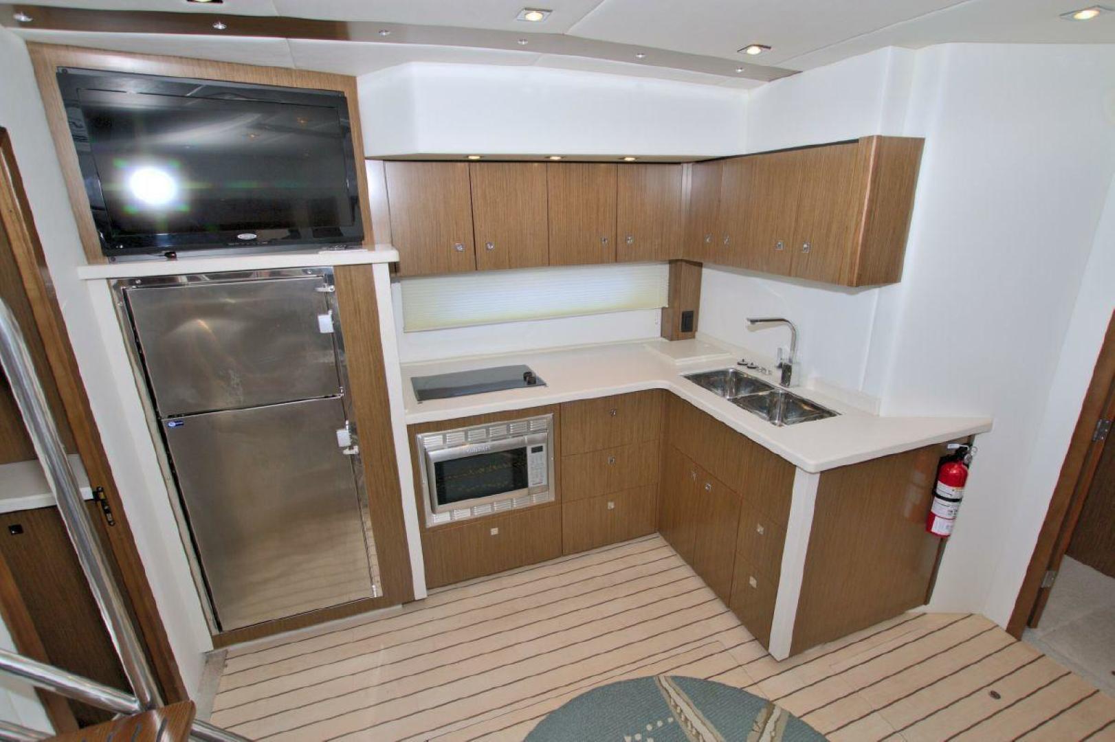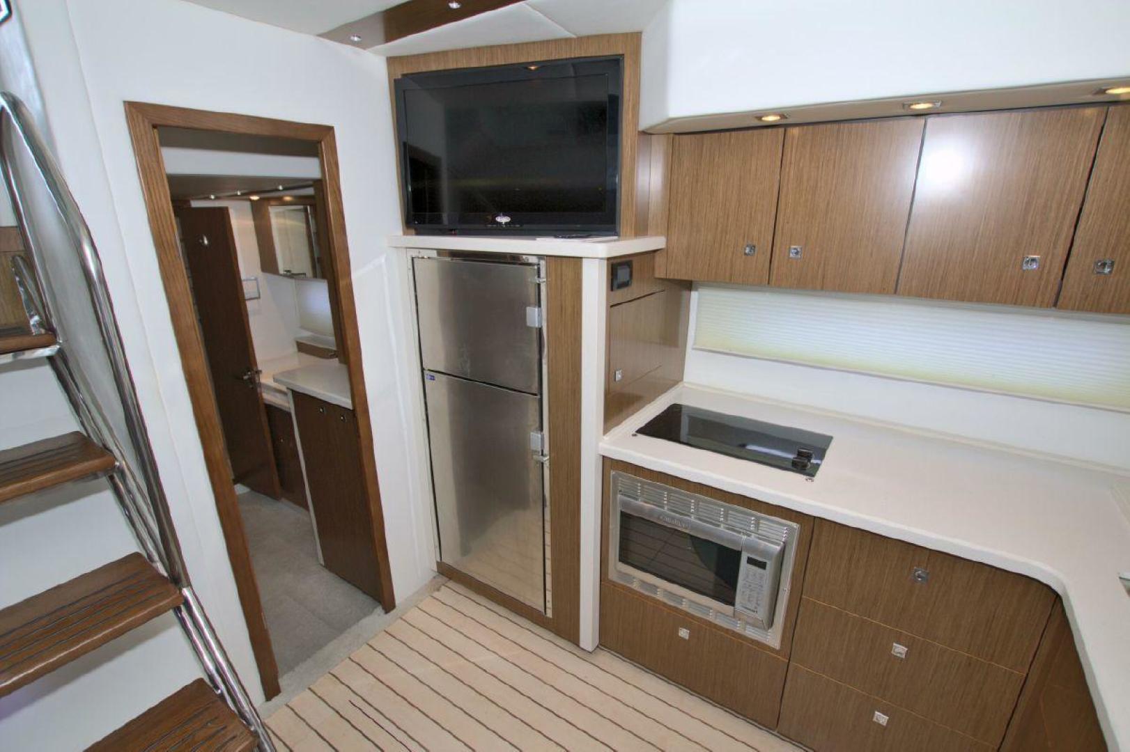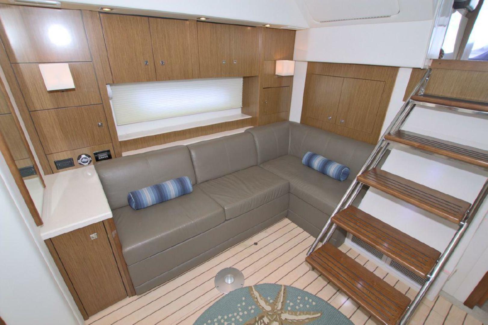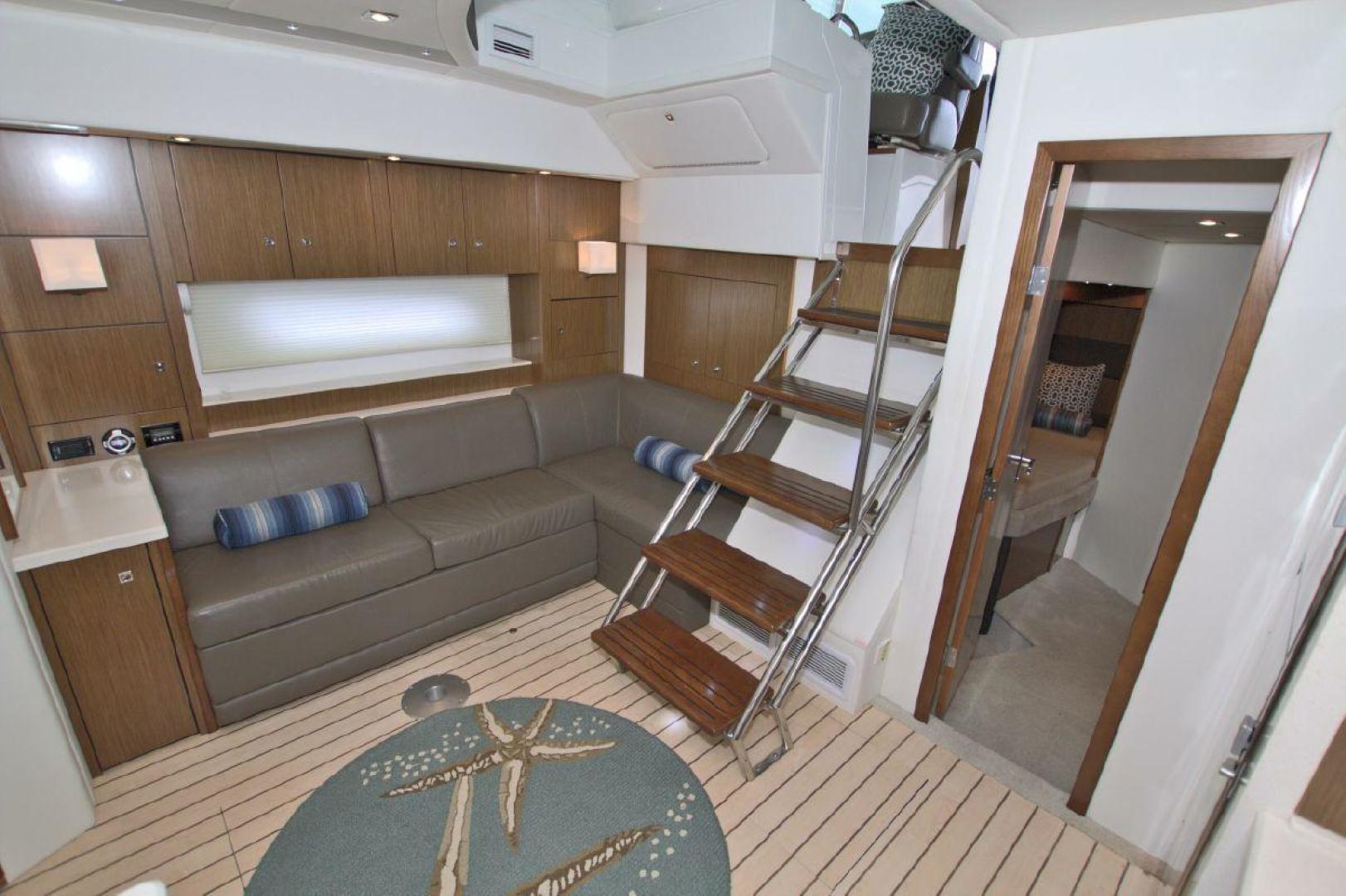 To starboard there is a large entertainment center with countertops, wet bar and hideaway TV on a remote controlled lift. To port a U shaped sette will seat 6 guests with a high low folding table. Stereo with speakers throughout.