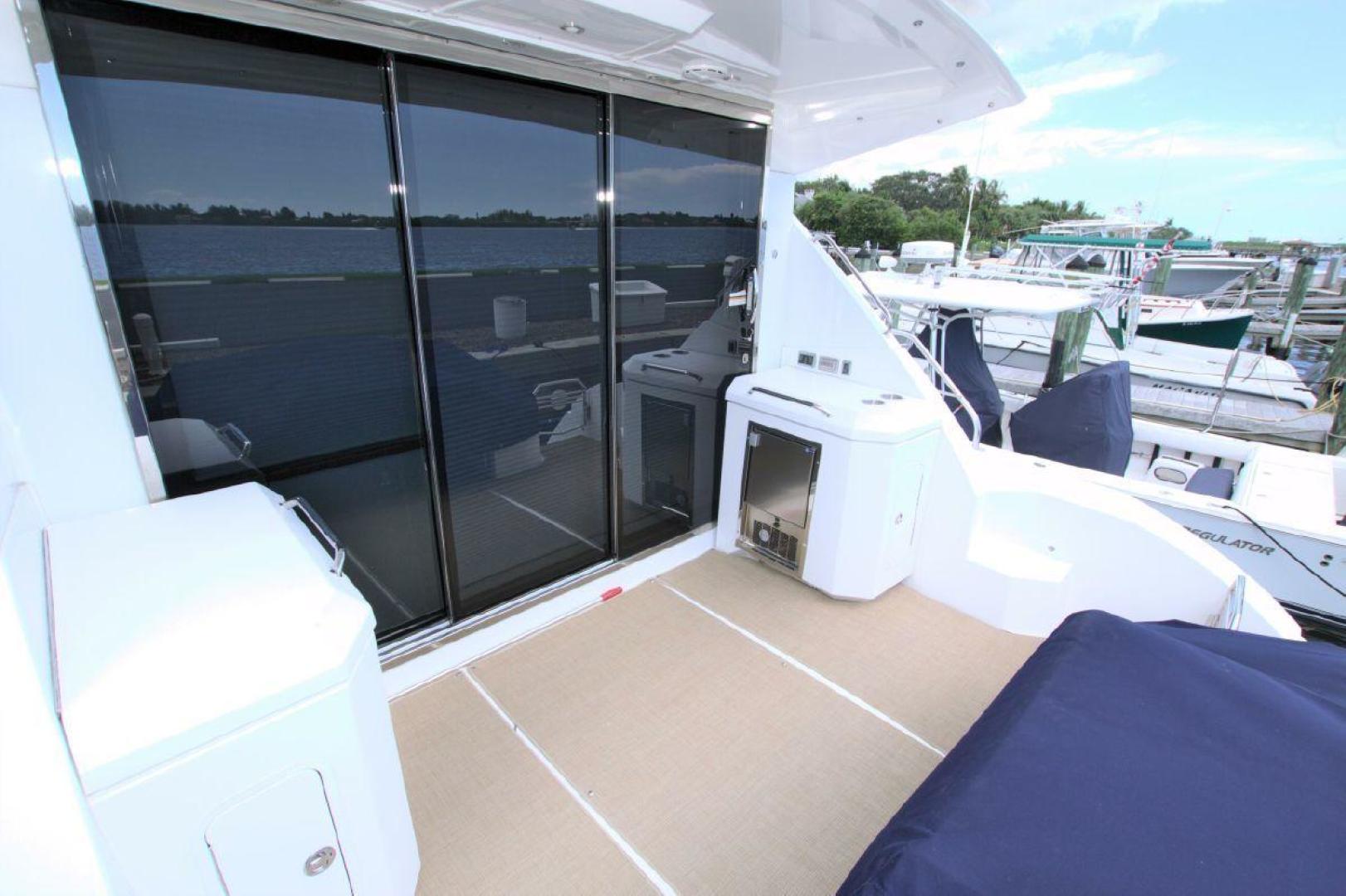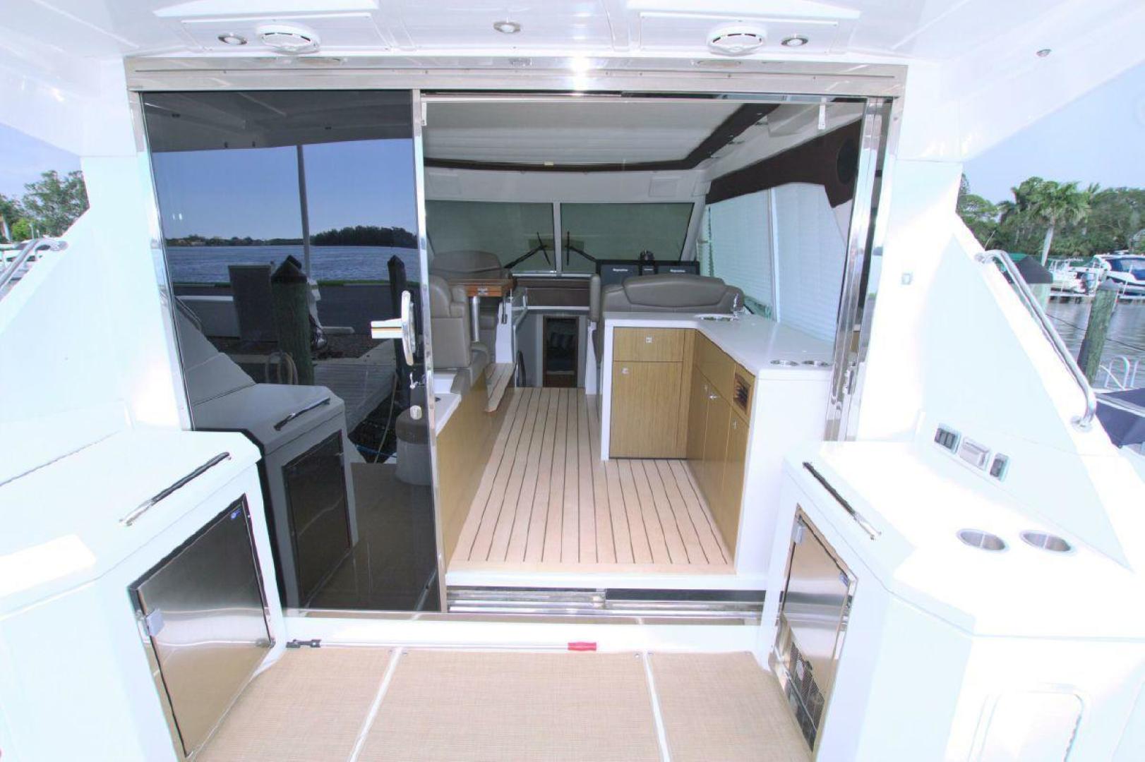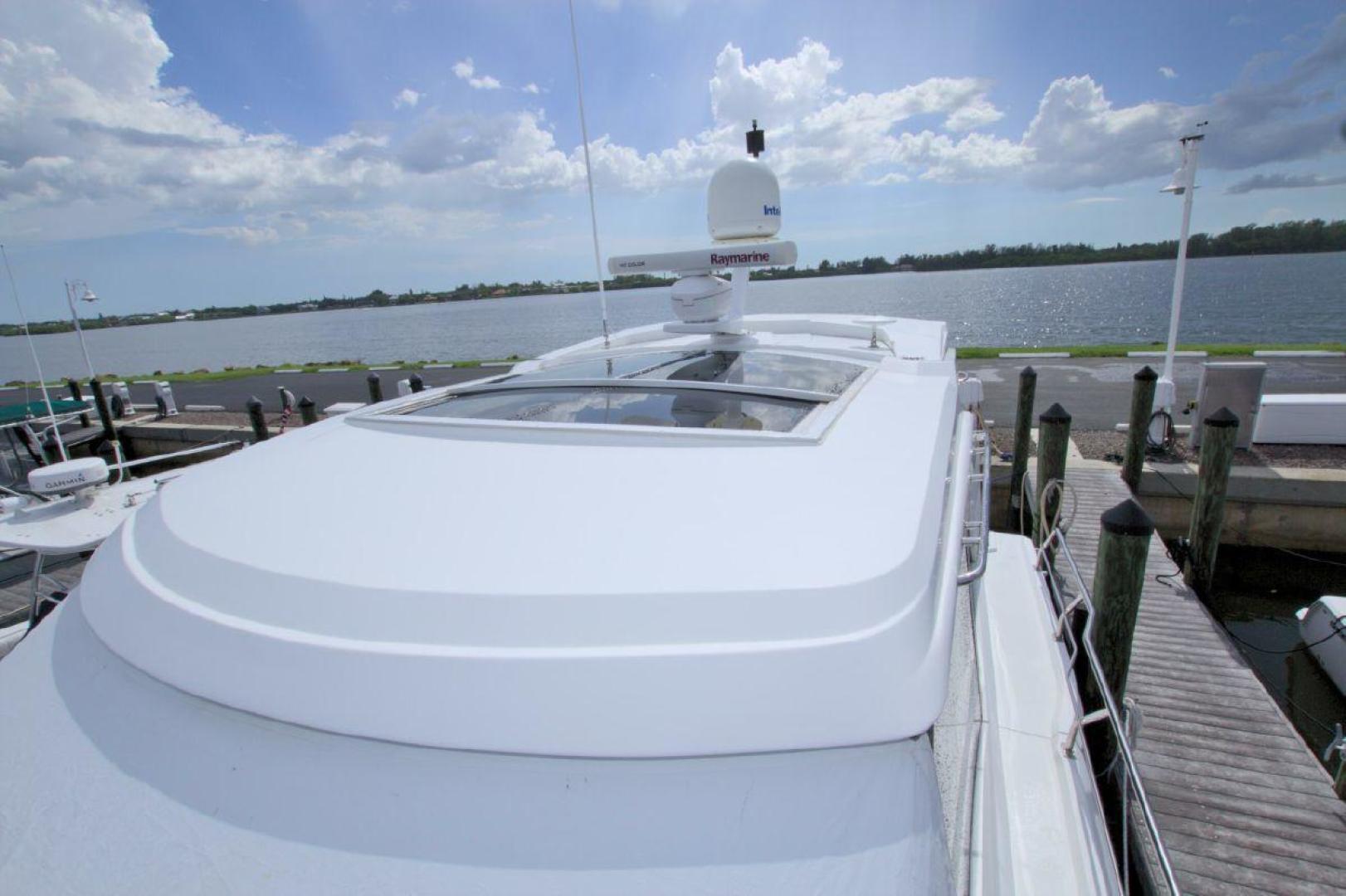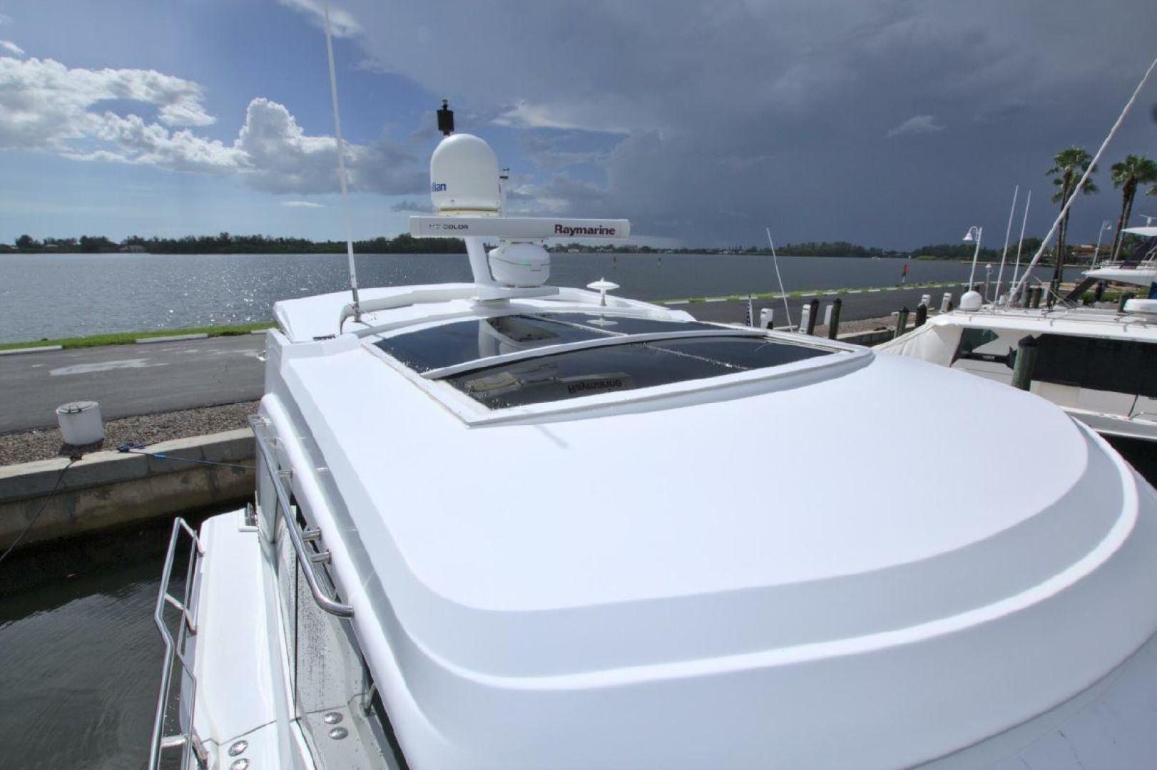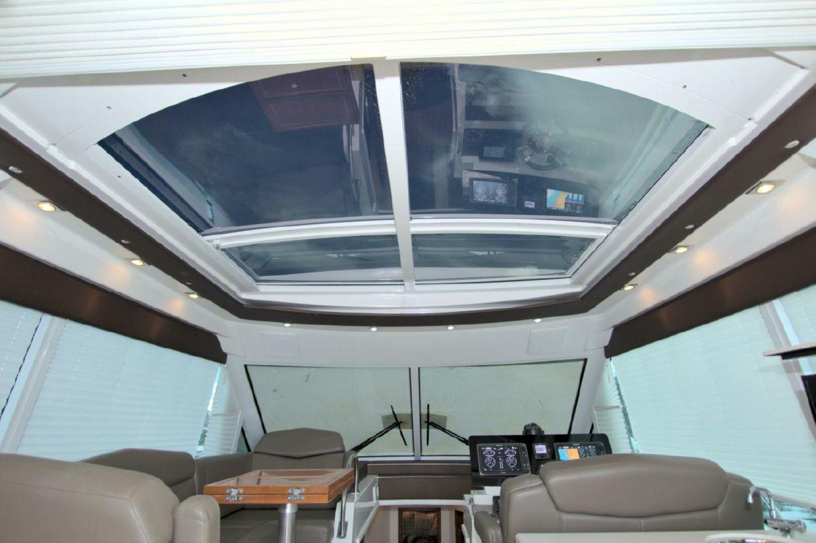 Stepping into the first of 2 Salons you will first notice the complete abscence of canvas to take down or cloudy eisenglass to deal with, as you will find on most express cruisers.. A three piece sliding door opens the climate controlled Salon to the outside and Panaramic full 360 views dominate. A 6' sliding glass sunroof with retractable shade will completely open up the entertaining spaces.