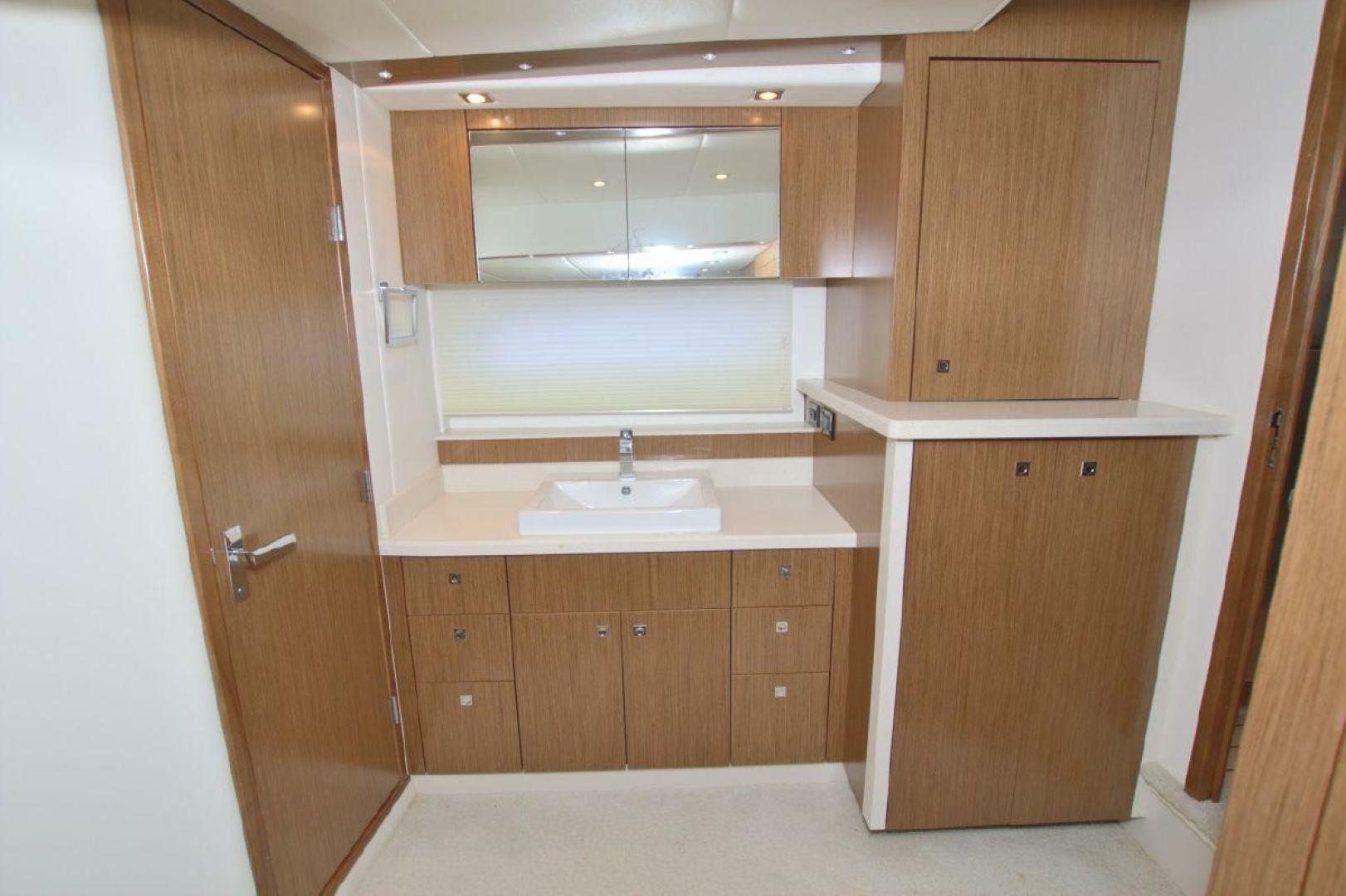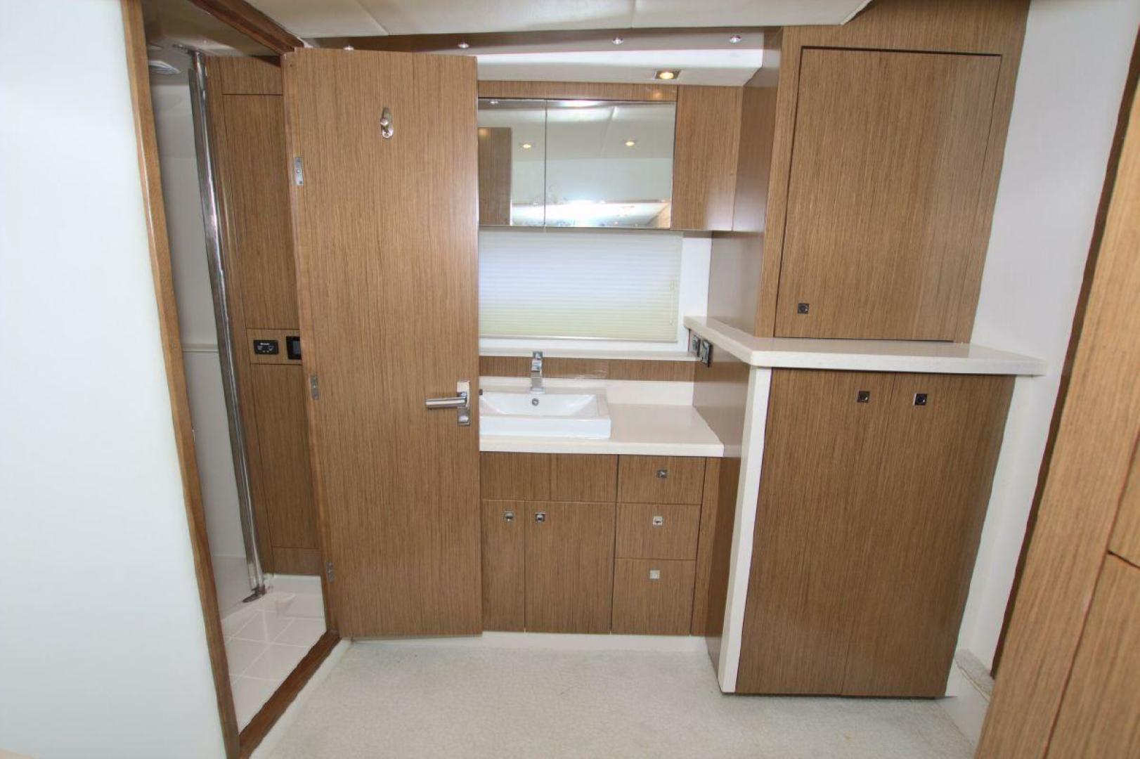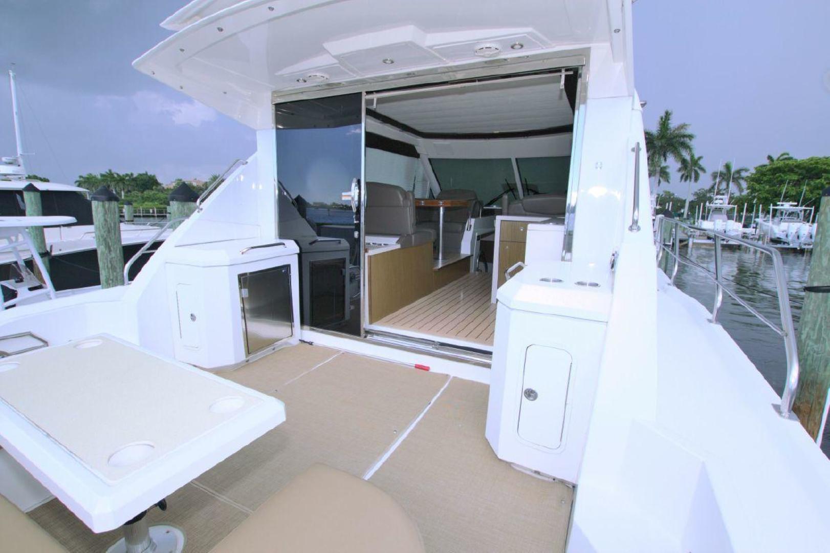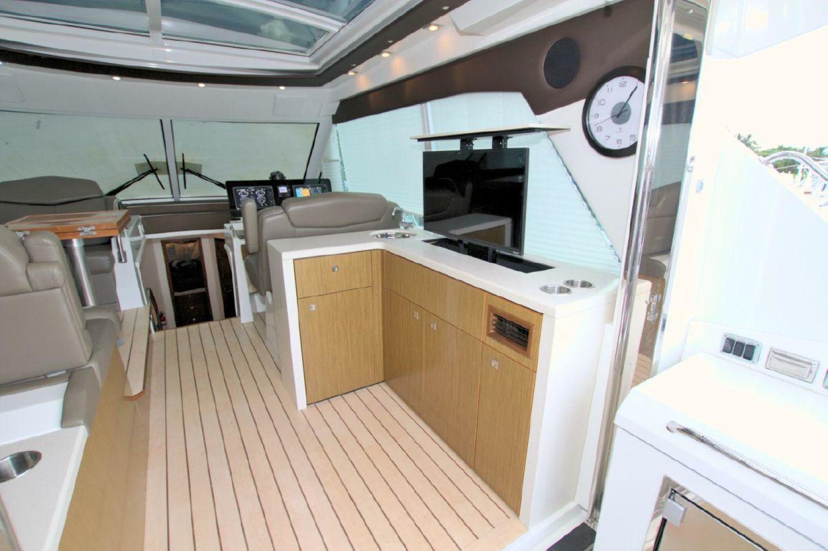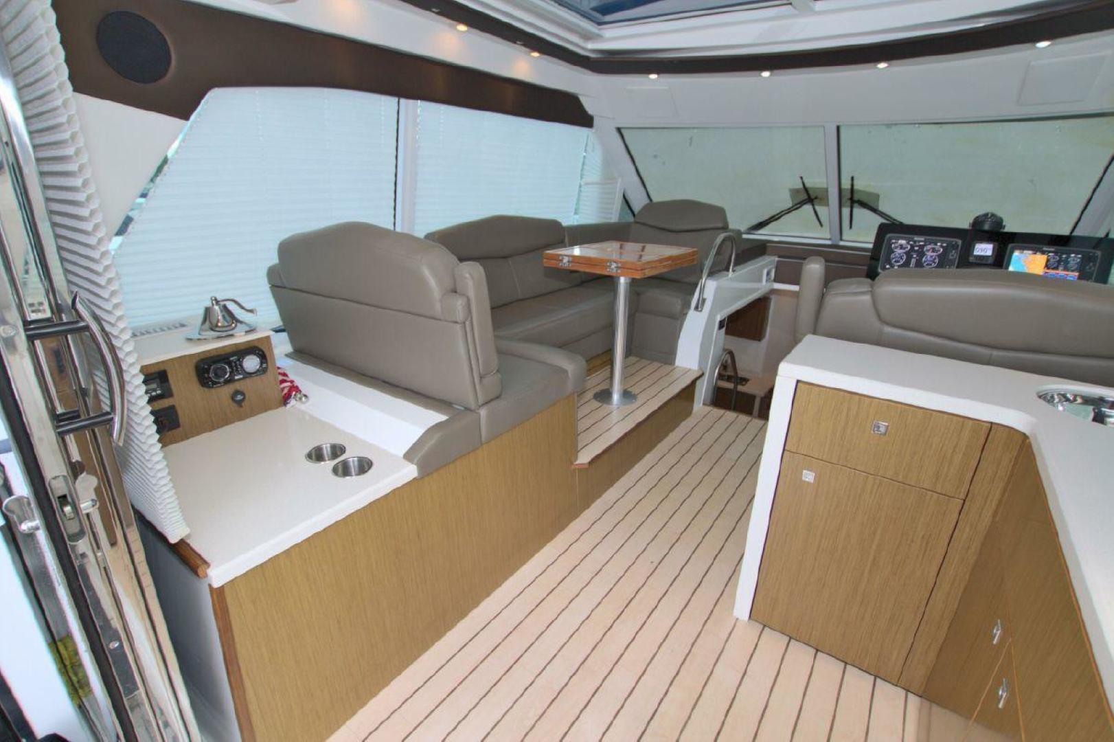 Stepping into the first of 2 Salons you will first notice the complete abscence of canvas to take down or cloudy eisenglass to deal with, as you will find on most express cruisers.. A three piece sliding door opens the climate controlled Salon to the outside and Panaramic full 360 views dominate. A 6' sliding glass sunroof with retractable shade will completely open up the entertaining spaces.