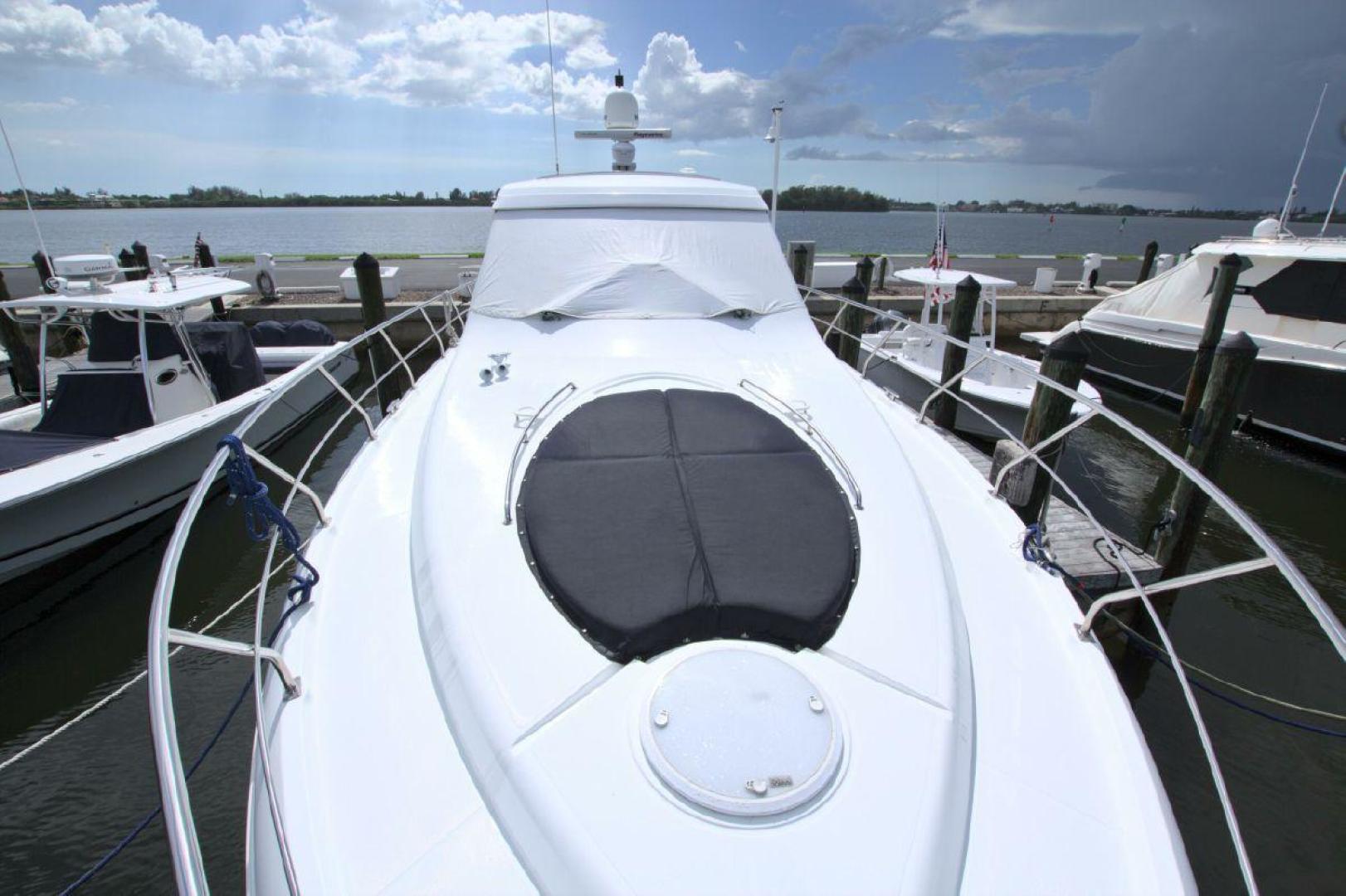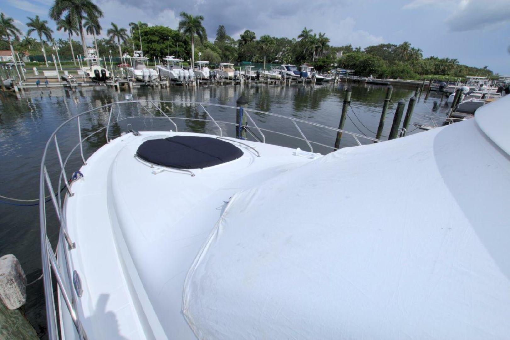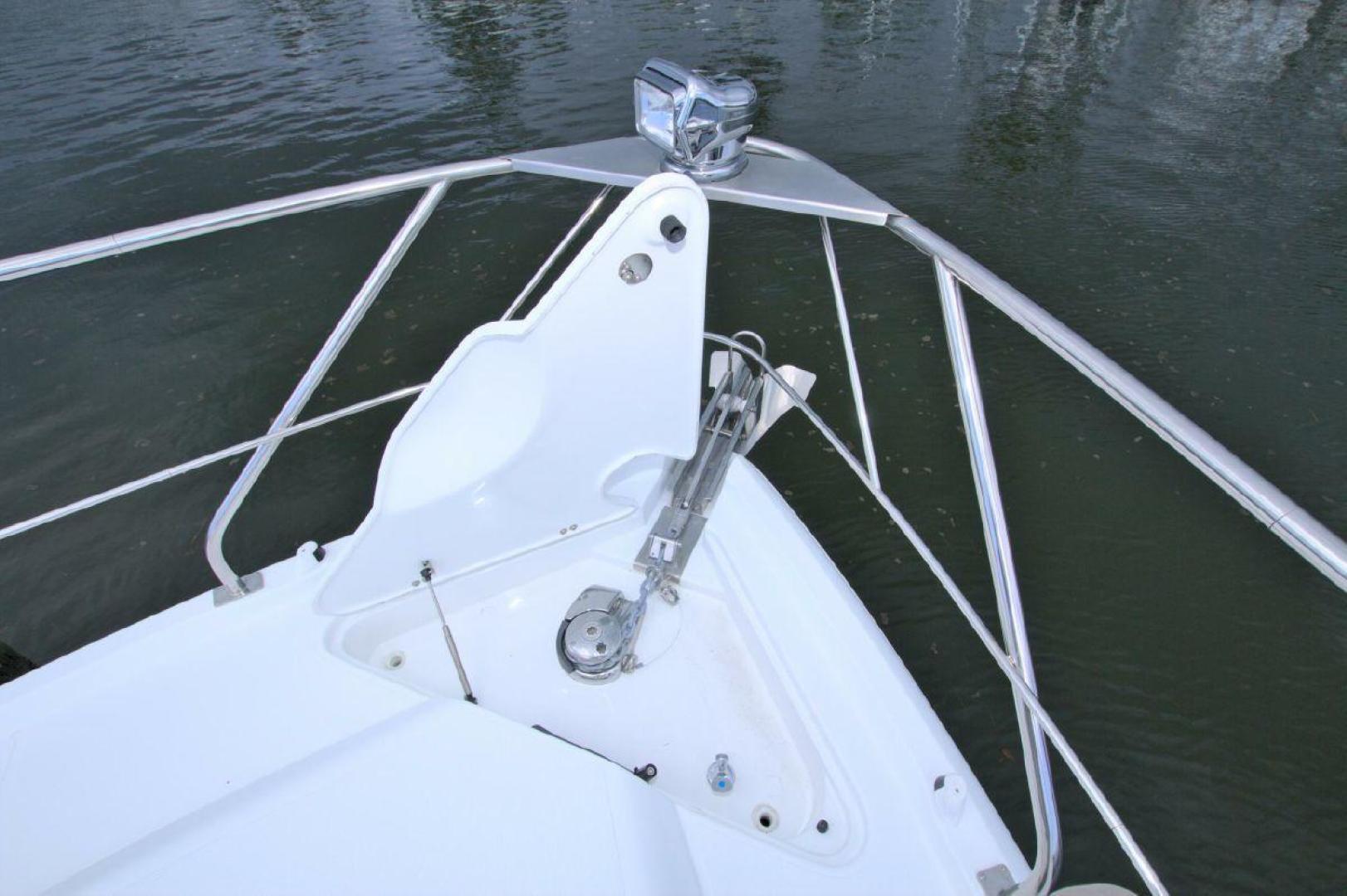 Going forward is easy thanks to wide footings with ample non skid surfaces. Handrails along the Salon roof. There is a bow sunpad with canvas covers.Low profile Anchor Windlass is concealed at the bow. Windshiled wipers and windshield cover. Search Light.