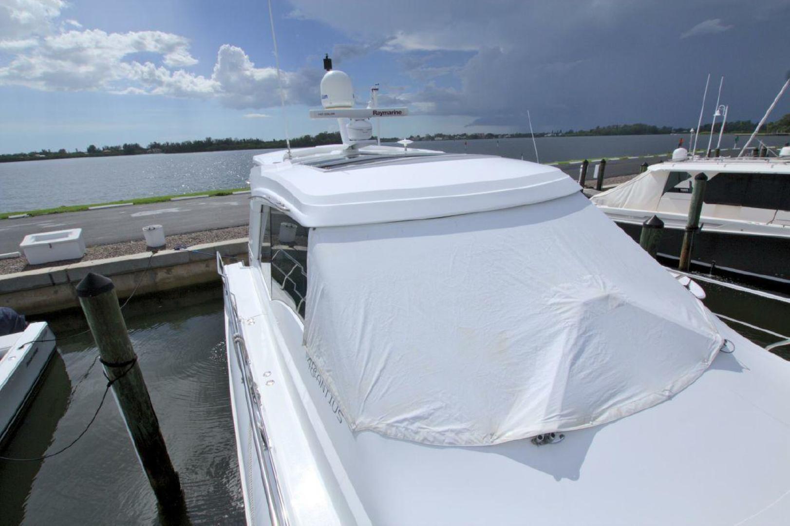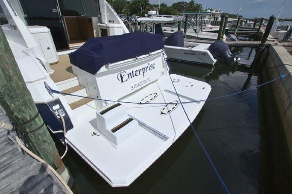 The entertainment from the upper Salon continues here with an outside grille, icemaker and refridgerator. Plush U shaped seating with a table can also convert to a sunlouge. If the sun is too much, a shade will retract from the roof at the touch of a button. Canvas covers protect the upholstry when in storage. Cockpit carpets. Cockpit shower. Shorepower with cablemaster retrieval system.