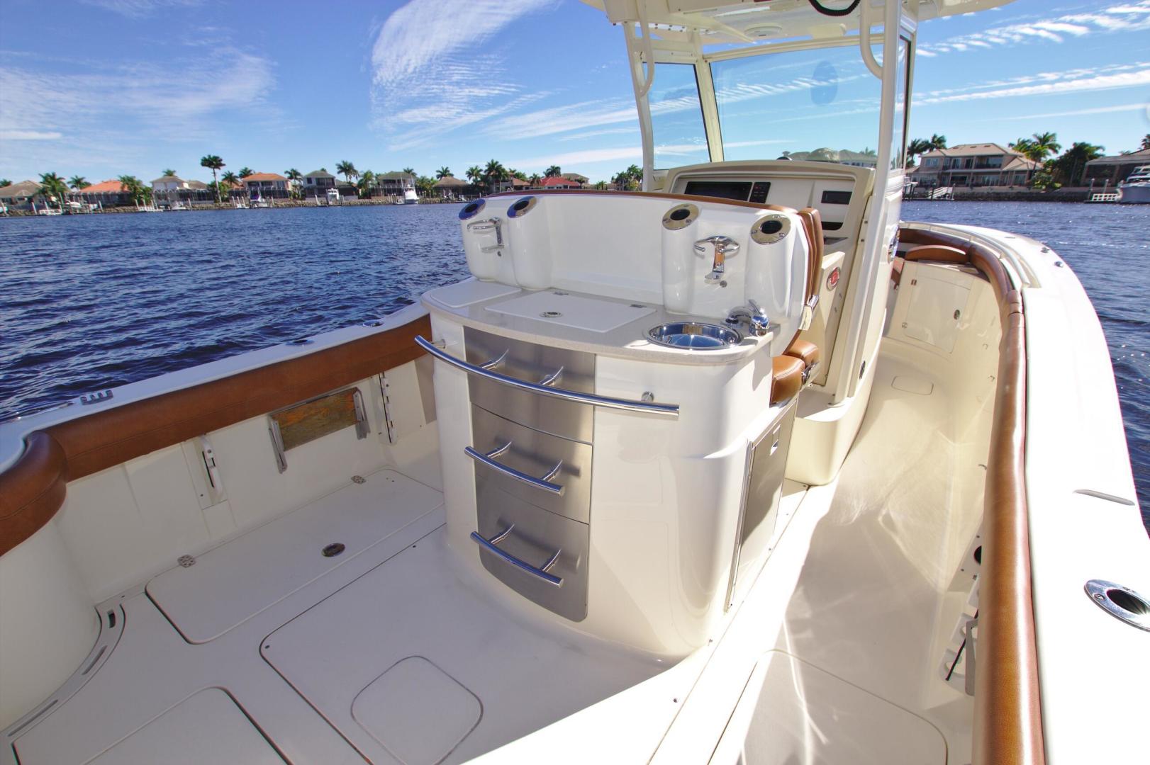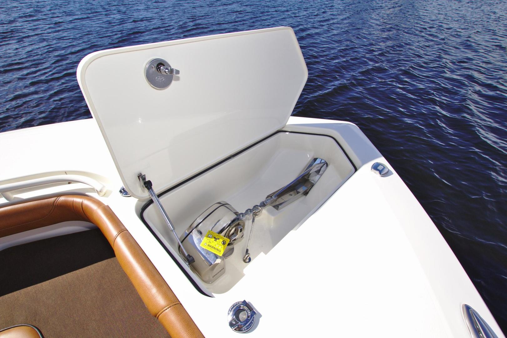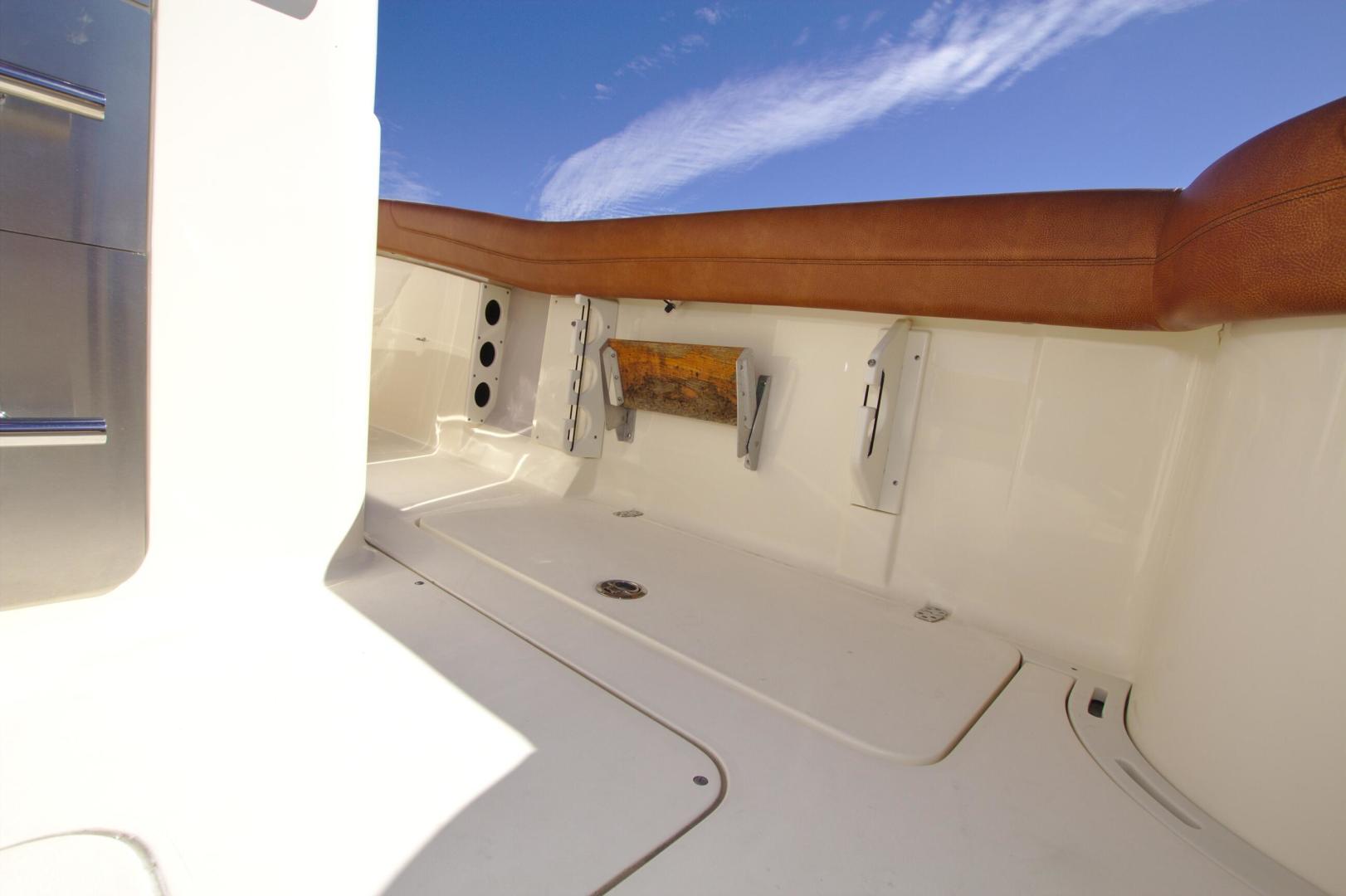 Scout is known for introducing models with market-first innovations that separate our models from the competition, and the 275 LXF is no exception. One interesting feature is the wave gate/fold down stern seat that folds down all the way to the deck floor creating easy access to the transom, swim platforms and engines. The model showcases Scout’s patented T-top/hardtop w/ tempered glass enclosure, a one-of-a-kind electronically actuated sliding electronics Plexiglas window at the helm that completely protects your electronics package, and our revolutionary Nu-V3 high performance, fuel saving hull design. The cockpit offers spacious fishing room, as well as a bait prep station w/ sink and stainless tackle drawers.