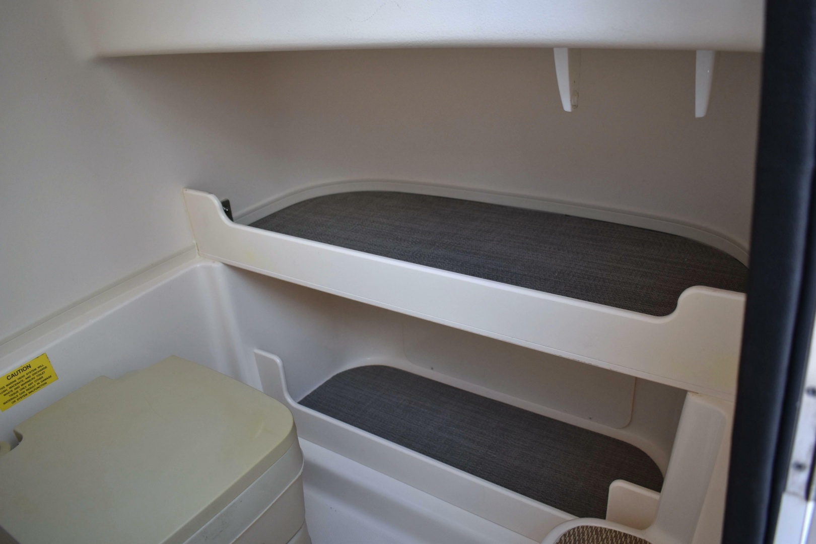 Head - lockable console w/stand up head area, dome light, storage shelves & hanging locker